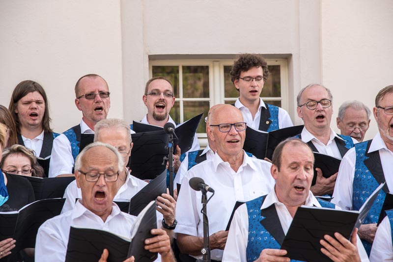 Unter der Leitung unserer 2. Chorleiterin Maja Seidel absolvierten wir einen anspruchsvollen Nachmittag mit insgesamt 4 Auftritten. Davon 2 ca. 20minütige eigene Konzerte sowie die 2 gemeinsamen Auftritte mit anderen Chören auf der Hauptbühne vor dem Schloss. 13 gemeinsame Lieder, die im Vorfeld doch eine sehr intensive Probentätigkeit nur für dieses Chorfest erforderten, wurden durch die Chöre zum Besten gegeben. Und unsere eigenen Titel (insgesamt 10 Lieder) mussten ja auch einstudiert werden bzw. wieder „aufgefrischt“ werden.