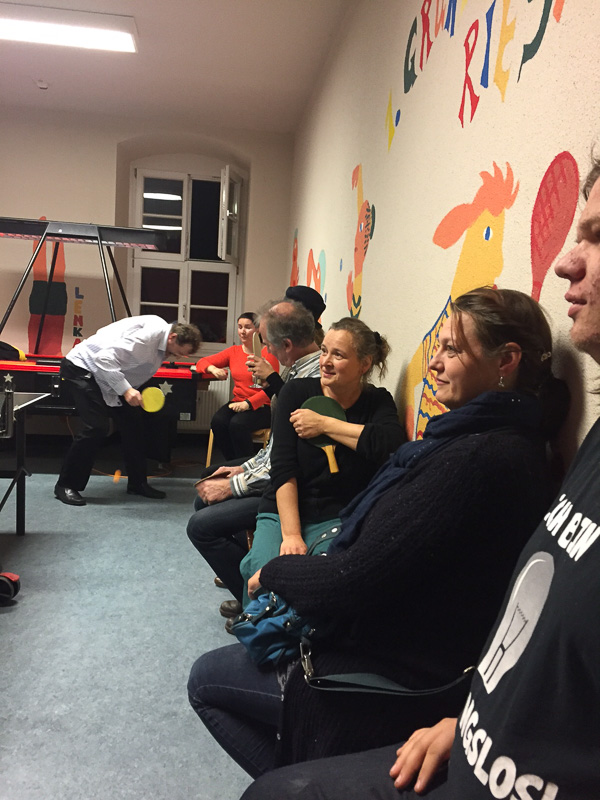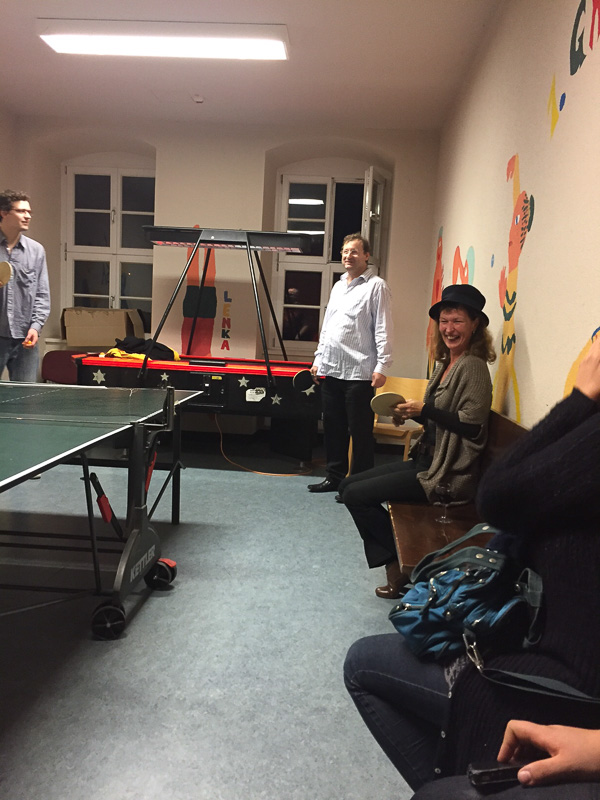 So verging die Zeit wie im Flug und der Grillabend mit kultureller Umrahmung unseres DJ rückte näher. Natürlich war das kulinarisch-köstliche Grillgut ein Highlight, aber erst nach dem Essen ging es richtig los. Einige sportliche Sangesfreunde unter uns versuchten sich auch im chinesischen Tischtennis. Sogar unsere Co-Chorleiterin Maja war teilweise dafür zu erwärmen. Der leckere Wein und der Sport scheinen auch eine ganz besonders witzige Kombination zu sein, denn es wurde viel und herzlich gelacht dabei. Getanzt wurde auch und doch schien es, als würde etwas fehlen. So machte ich mal wieder die rasende Reporterin – habe bei Carla Kolumna in den Kleinkindjahren meiner Töchter entsprechende Anleitungen erworben – und fing Stimmen aus der Menge ein. Die Interviews haben Spaß gemacht und jeder der Befragten hat ehrlich seine Meinung gesagt. Dabei habe ich unsere Youngsters genauso liebevoll ausgequetscht wie die Chorleiter und die erfahrenen Hasen. War Klasse und die Ergebnisse habe ich für Euch in einer extra Datei zusammen getragen.