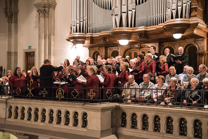 Unser Gastchor, der ZDF-Chor aus Mainz, ein Männerchor unter der Leitung von FDB Franz Jürgen Dieter, setzte das Konzert fort. Die andächtige Stille des Publikums, wie sie bereits bei den ersten Vorträgen feststellbar war, machte deutlich, wie aufmerksam es dem Gesang folgte. Die sehr gute Qualität des Vortrags führte trotz der Bitte des Moderators, während des Konzerts keinen Beifall zu spenden, zu eben dieser Unterbrechung. Dazu trugen außer dem Chor als Ganzes auch die beiden Solisten einen Teil bei.