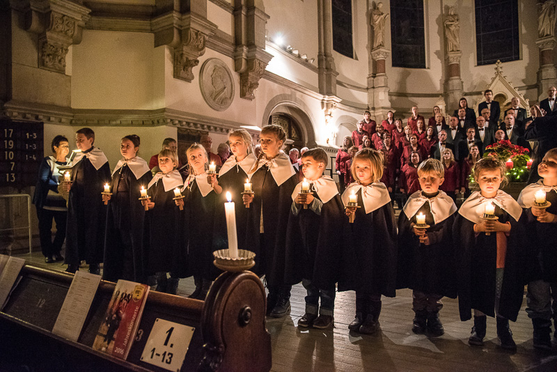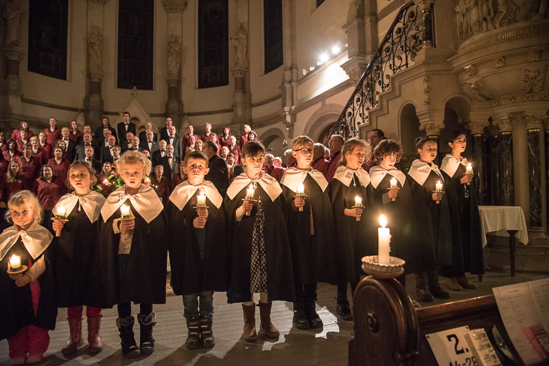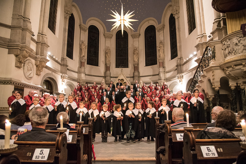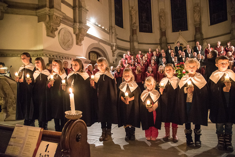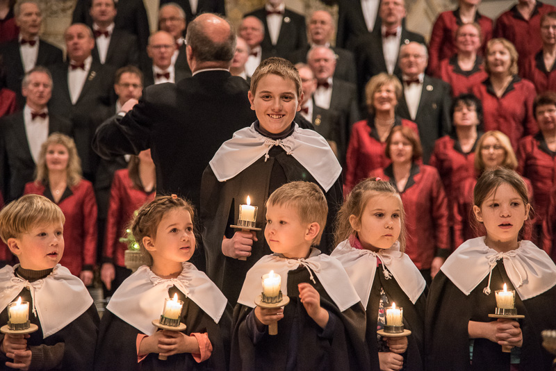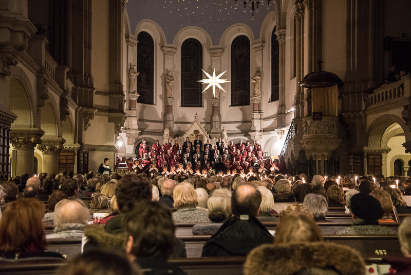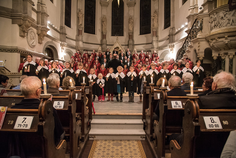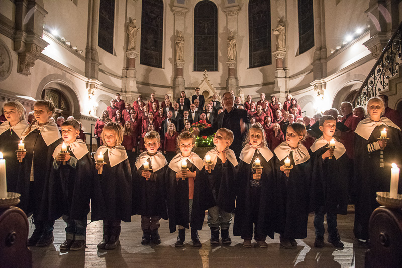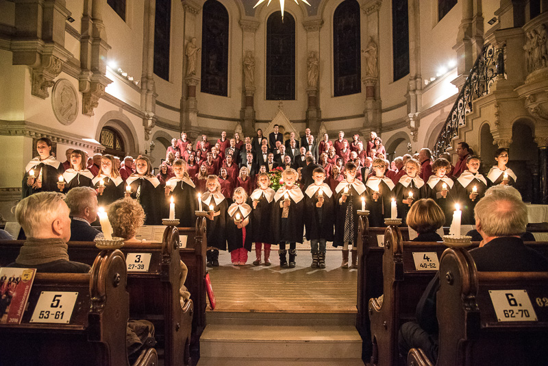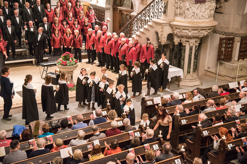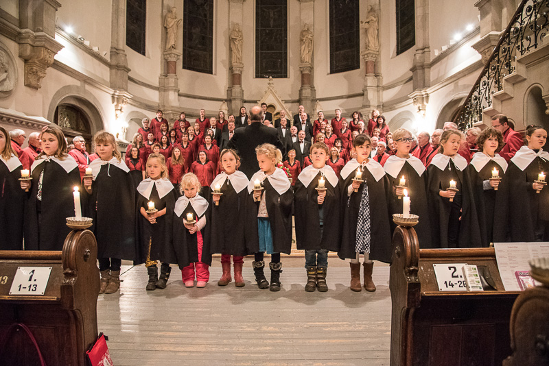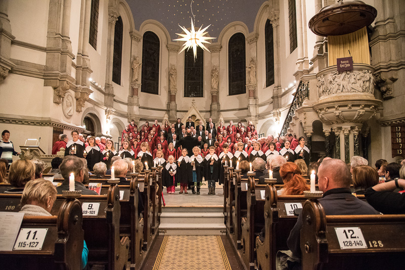 Zum Abschluss des Konzerts fanden sich alle Sänger und Musiker vor dem Altar ein und begleiteten den traditionellen Einmarsch der Kurrende, wechselweise unterstützt von der Orgel und den Blechbläsern und zuletzt zusammen mit den Stimmen der Besucher mit „Es ist ein Ros entsprungen“, „Stille Nacht“ und „O du fröhliche“.