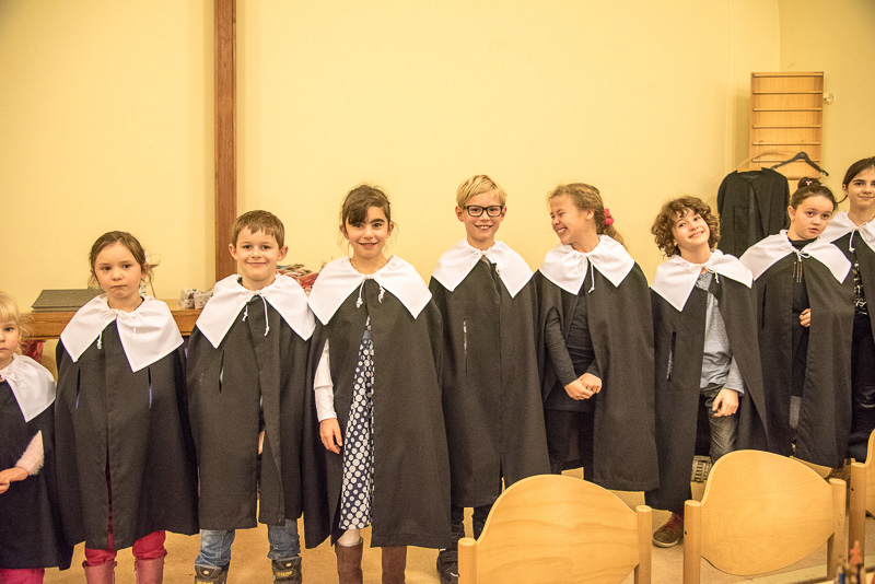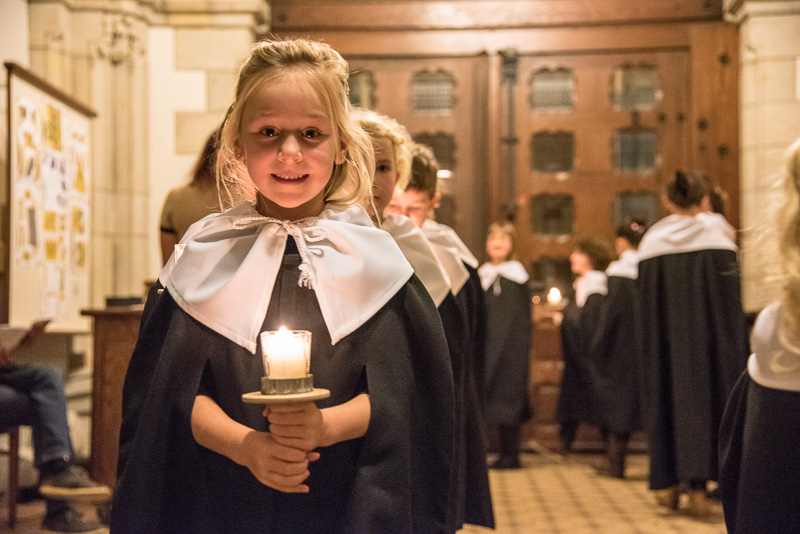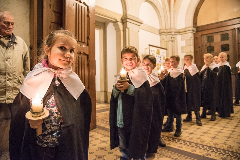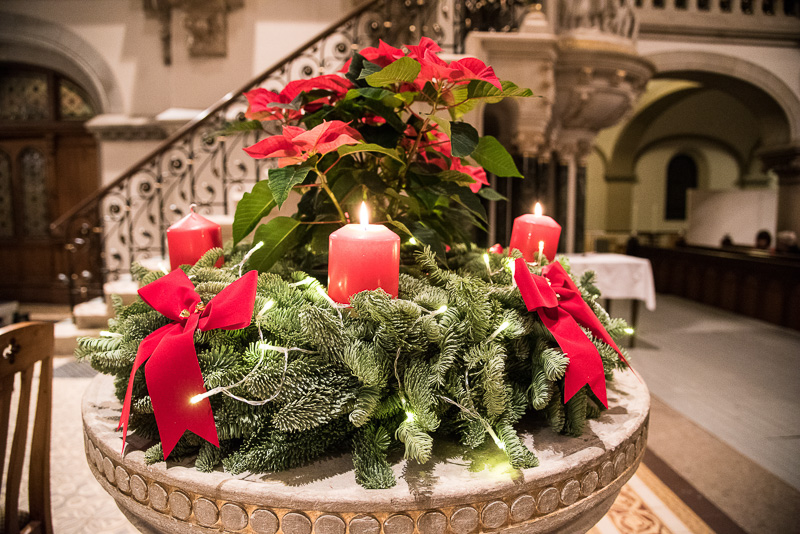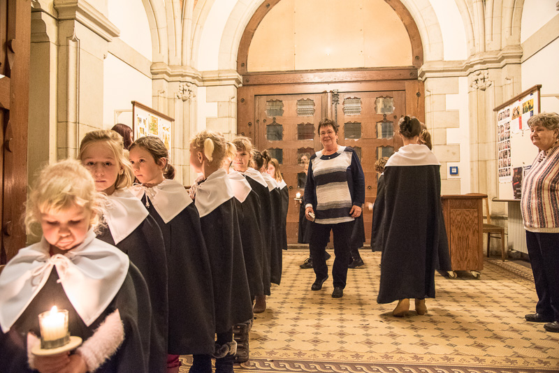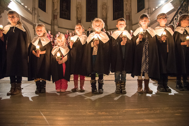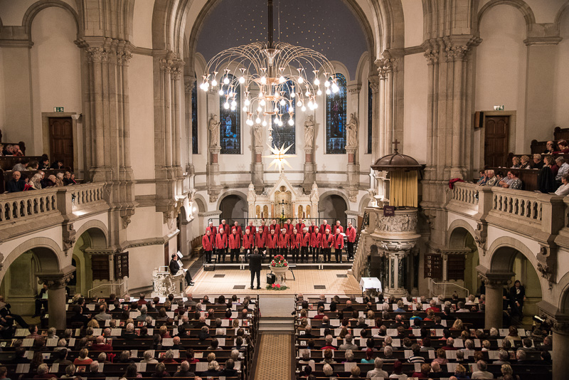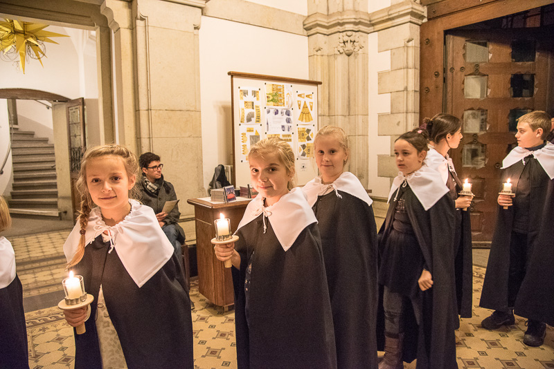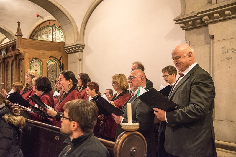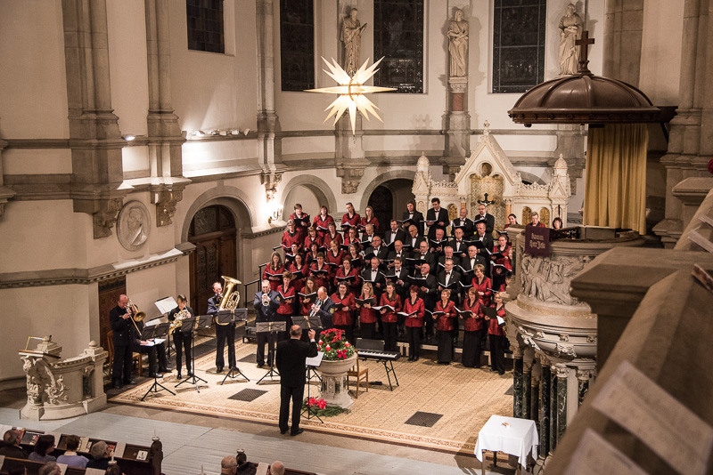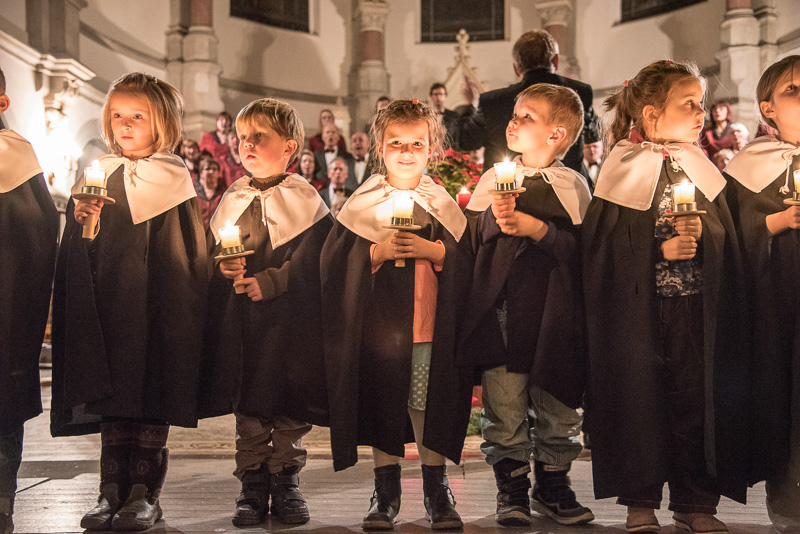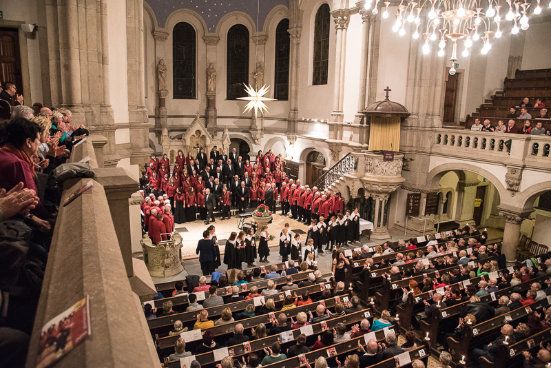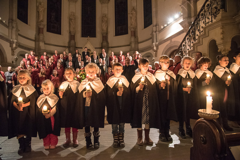 Zum Abschluss des Konzerts fanden sich alle Sänger und Musiker vor dem Altar ein und begleiteten den traditionellen Einmarsch der Kurrende, wechselweise unterstützt von der Orgel und den Blechbläsern und zuletzt zusammen mit den Stimmen der Besucher mit „Es ist ein Ros entsprungen“, „Stille Nacht“ und „O du fröhliche“.