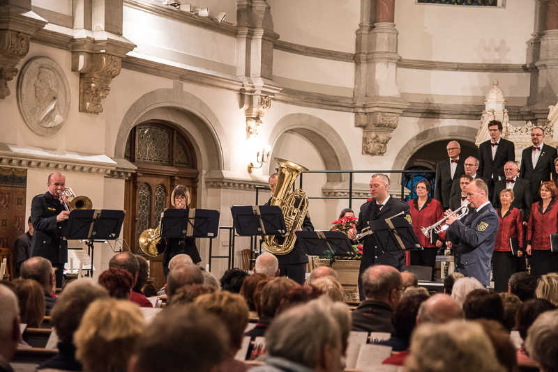 Das Blechbläserquintett des Polizeiorchesters Sachsen unter der Leitung von Thomas Mende eröffnete das Konzert schwungvoll mit der Nussknackersuite von P. Tschaikowsky, worauf der Polizeipfarrer Christian Mendt die Gäste – mit über 1600 waren bei beiden Konzerten fast alle Plätze besetzt – begrüßte. Er führte auch die folgenden Moderationen durch.