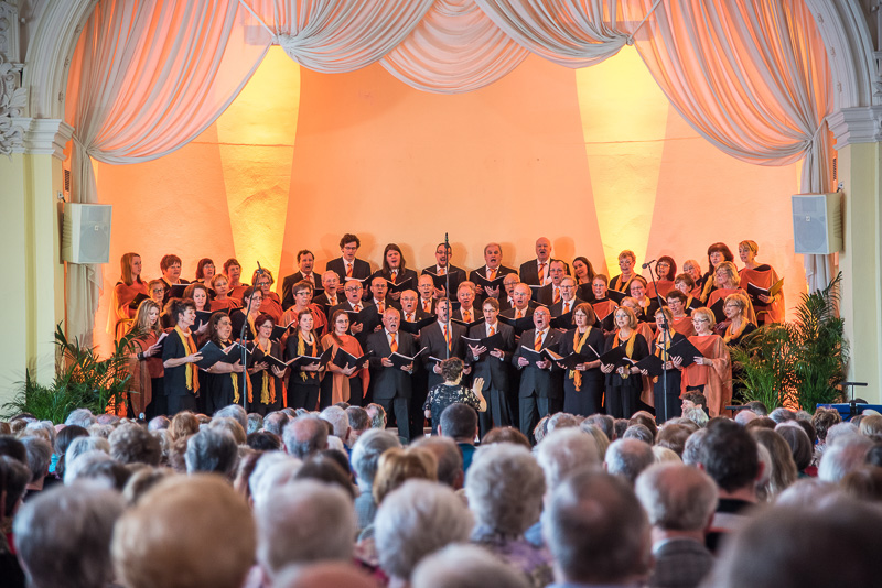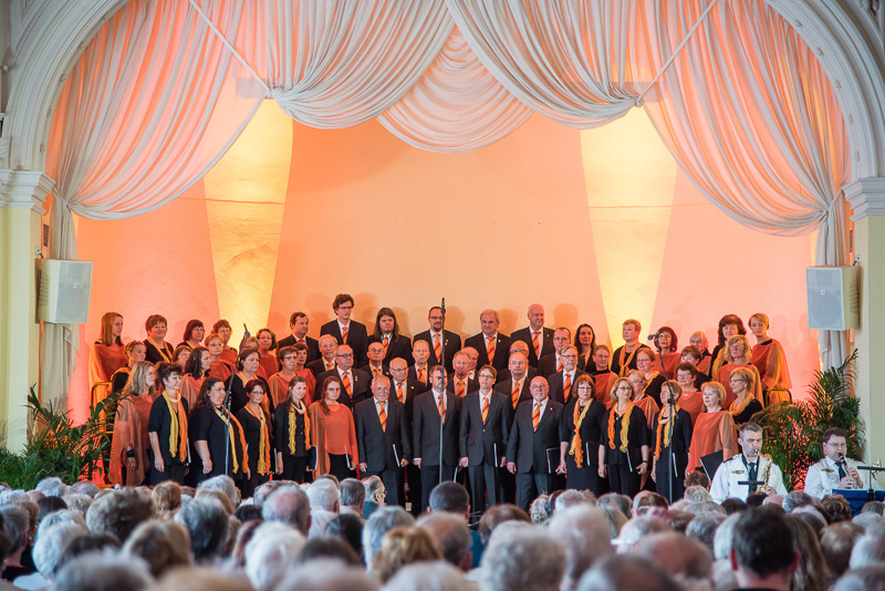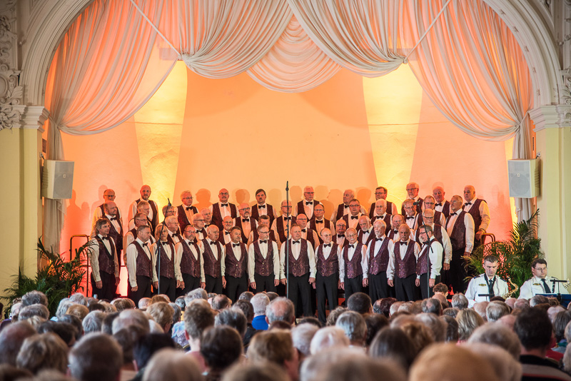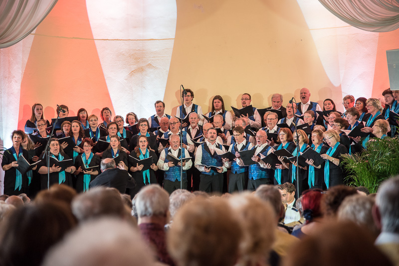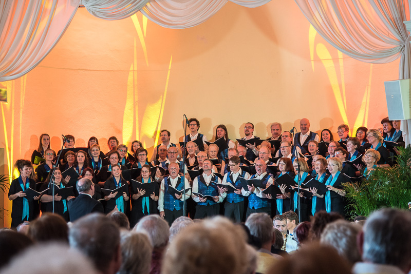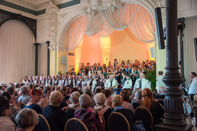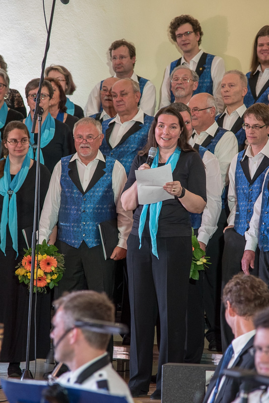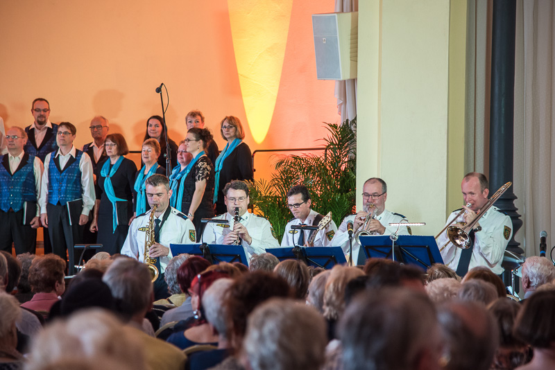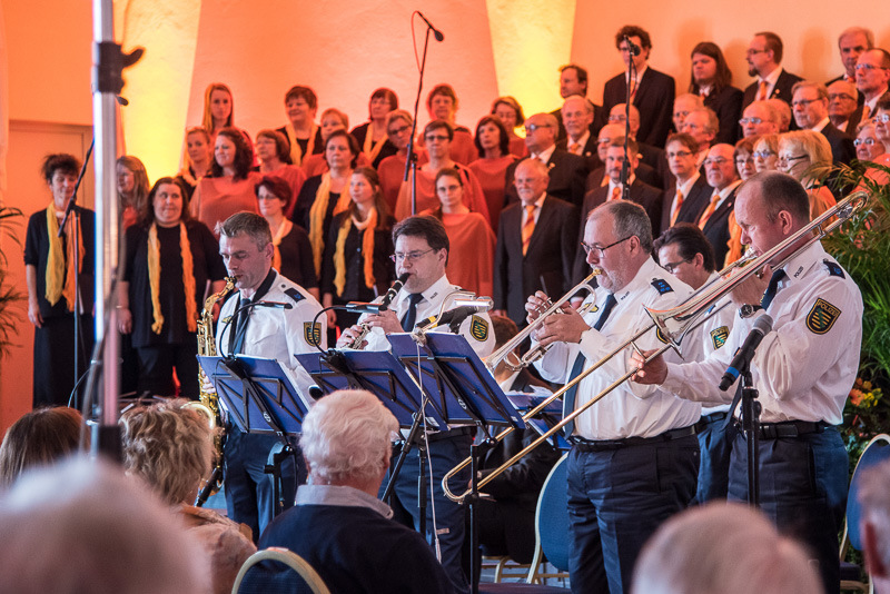 Der Polizeichor Dresden unter der Leitung von Torsten Petzold begann danach, einen bunten Strauß deutschsprachiger Volkslieder aus dem 16. bis zum 20. Jahrhundert zu entfalten, der von der aufblühenden Natur, von zwitschernden Vögeln und von Liebe handelte. Bei dem Mitsingetitel „Alle Vögel sind schon da“ unterstützten viele Zuhörer den Chor. Unser Auftritt wurde durch zwischenzeitliche Beiträge sowohl der Dixielandformation als auch von Kathy Leen (jetzt auch als hervorragende Sängerin und begleitet von ihrem Ehemann Prof. Holger Miersch) abwechslungsreich gestaltet. Außerdem hatte unsere 2. Chorleiterin, Maja Seidel, mit „Ich komm aus fremden Landen her“ anlässlich des 500. Jahrestages der Reformation ein Lied von Martin Luther in das Programm aufgenommen, das, von unseren „Musici“ gesungen, ebenfalls reichlichen Applaus erhielt.