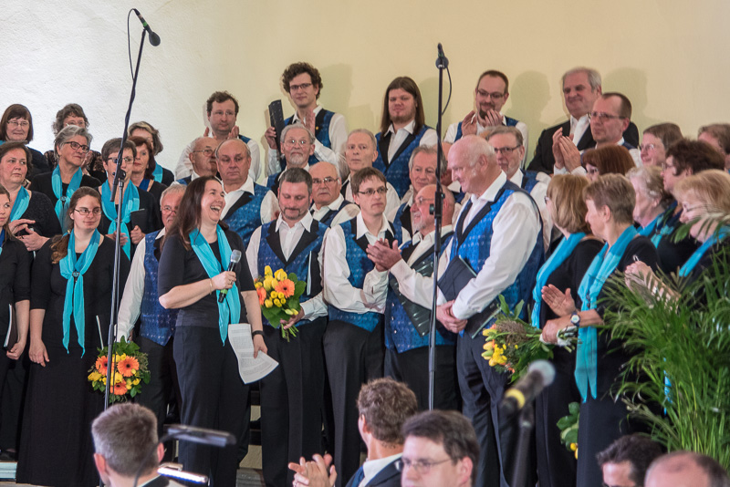Zum Abschluss des gelungenen Konzerts trafen sich alle Akteure auf bzw. vor der Bühne und spielten und sangen gemeinsam „Thank you for the music“. Lang anhaltender Beifall begleitete die nochmalige Vorstellung der Chöre, der Musiker und deren Leiter sowie der Sängerin bzw. Moderatorin.
