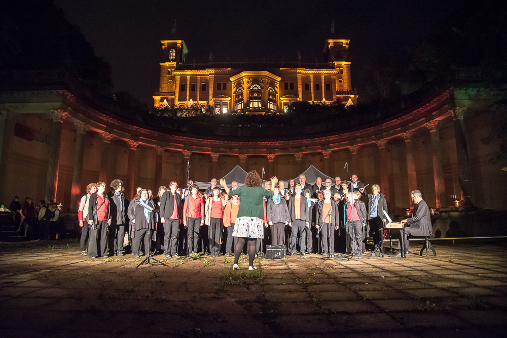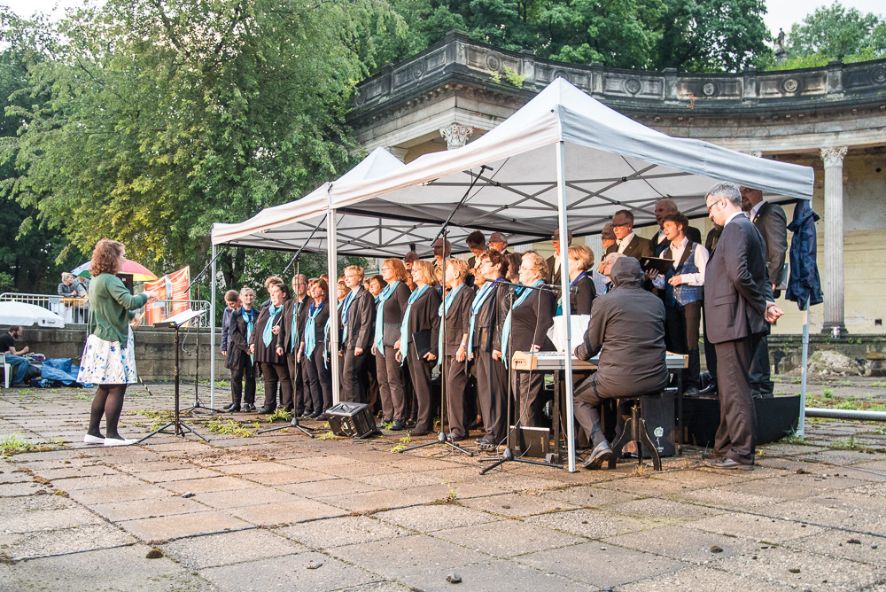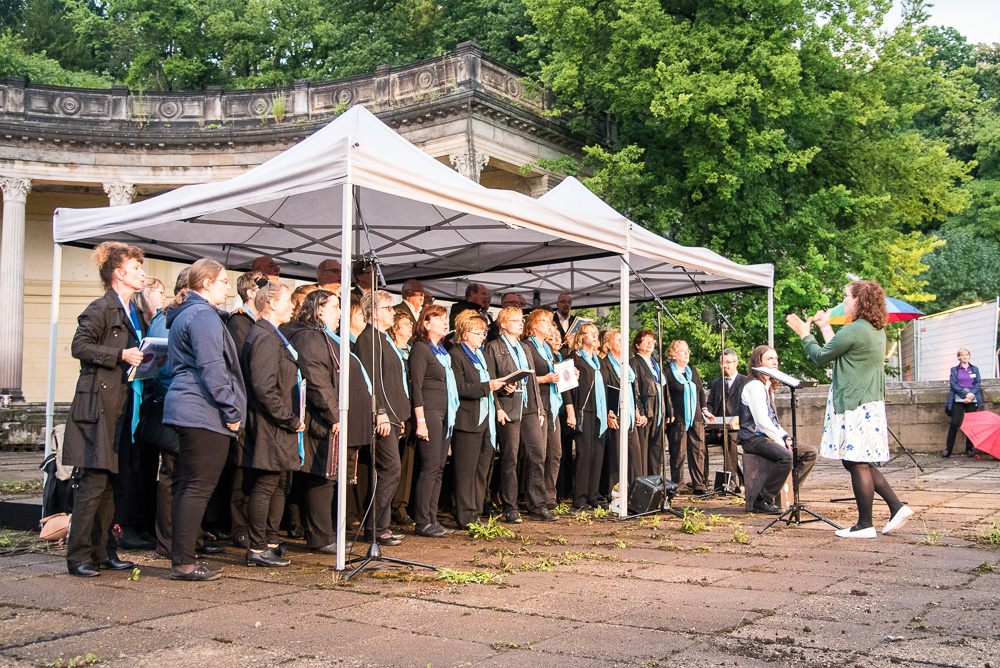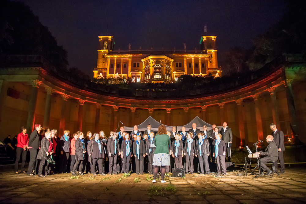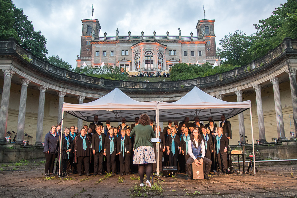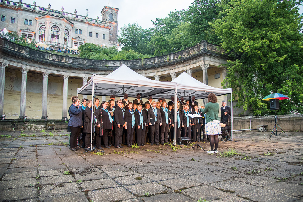 Super vorbereitet, mit anspruchsvollem Repertoire und kribbelnden Lampenfieber trafen wir uns am späten Samstagnachmittag vor dem Schloss Albrechtsberg. Gleich am Eingang vom Schloss Albrechtsberg wurden wir und die Gäste von bezaubernden Tänzerinnen auf Stelzen in prachtvollen Roben begrüßt und die Aufregung stieg. Die romantischen, nebeneinander am Elbhang liegenden drei Schlösser luden zur 9. Schlössernacht ein und wir waren auserwählt, gemeinsam mit vielen anderen Künstlern für den musikalischen Rahmen zu sorgen. Dabei hätte uns ein lauer Sommerregen sicher beeinträchtigt, aber keinesfalls davon abgehalten. Der Wolkenbruch allerdings, der kurz nach 19:00 Uhr niederging, vermittelte uns den Eindruck, dass der Himmel alle Schleusen geöffnet hatte. Während des Einsingens im trockenen Umkleideraum verwandelten sich die Wege des Schlossparkes in schlammige unbegehbare Pfade mit Sturzbächen aus Regenwasser und überdimensionalen Pfützen. Die gut gelaunten Sängerinnen des Frauenchores Cantores kamen vom gemeinsamen Auftrittsort, dem Römischen Bad resigniert zurück, weil ihr Auftritt ausgefallen war und auch unser erster Teil des geplanten Programmes musste gestrichen werden.