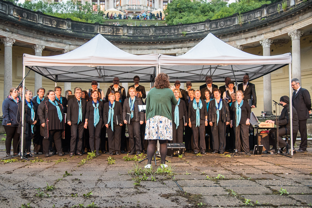 Der guten Stimmung im Chor konnte allerdings auch dieses Wetter nichts anhaben; wir probten noch einmal die wichtigsten Titel und hofften einfach auf eine Aufklarung des Himmels. Dieser Optimismus wurde belohnt. Sobald sich eine Wolkenlücke zeigte und für kurze Momente sogar ein paar Sonnenstrahlen durchbrachen, stellten wir uns im Römischen Bad auf und starteten mit der Krimiparade unser Programm. Der Kriminaltango kam super beim Publikum an und als wir davon sangen, dass die Mimi ohne Krimi nicht ins Bett geht, stimmten einige der Zuhörer sogar mit ein. Unsere beiden Chorleiter Torsten Petzold und Maja Seidel hatten mit Robert Seidel einen kompetenten Profi im Boot, um uns zu Höchstleistungen – selbst unter den schwierigen Bedingungen der Wetterkapriolen gepaart mit urlaubsbedingter Personalknappheit – zu motivieren. Sie dirigierten, begleiteten und sangen mit uns, was uns zu singenden Freunden vereinte. Unser aller Engagement wurde belohnt durch den Beifall des Publikums.