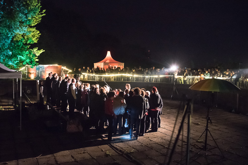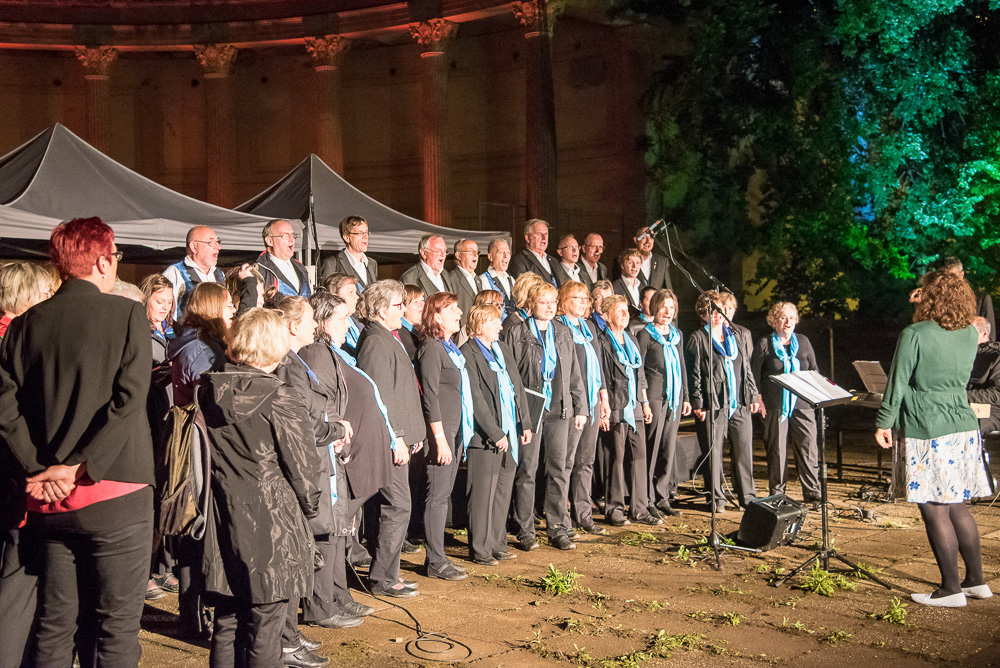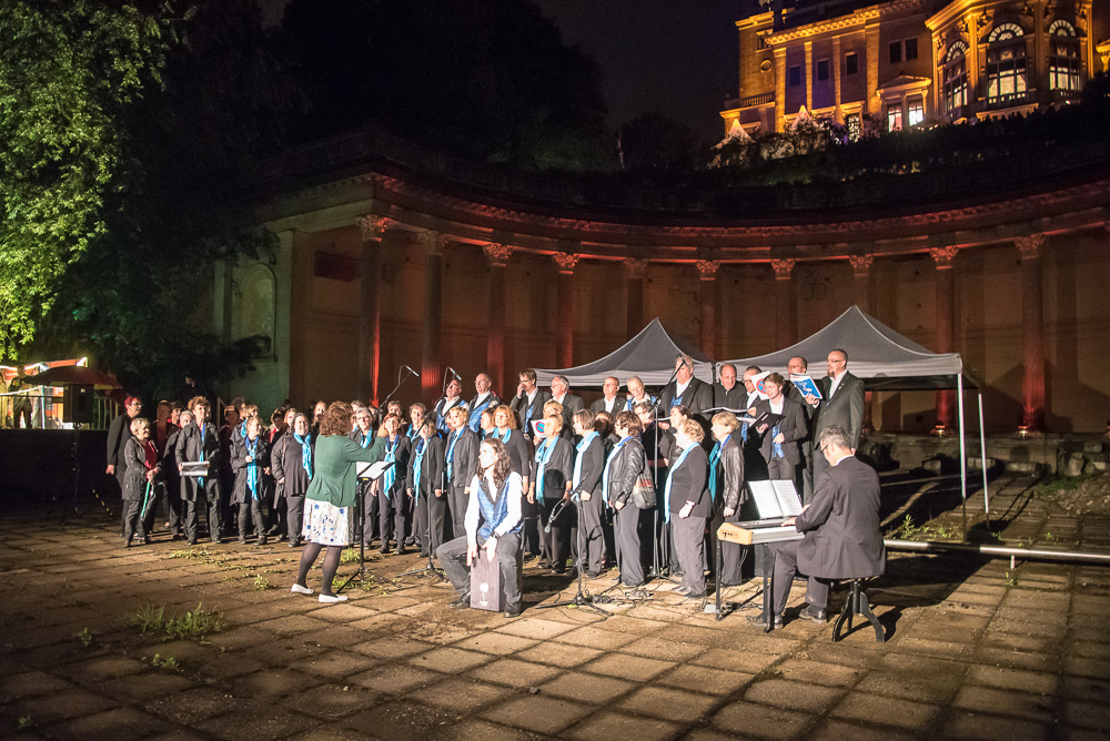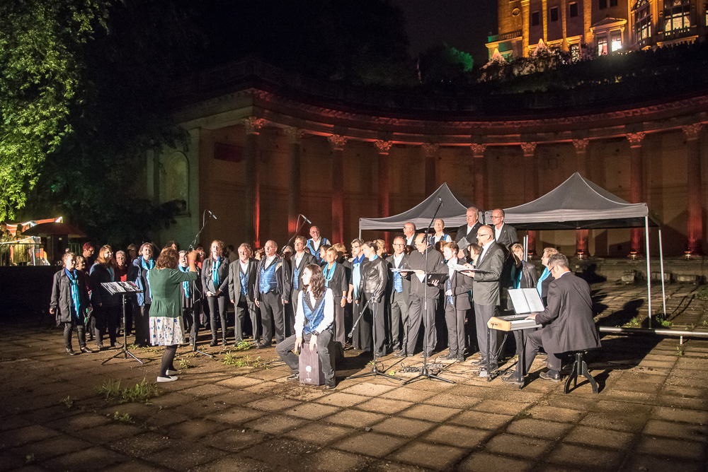 Als es soweit war, standen wir im Scheinwerferlicht in der Mitte des Römerbades. Unsere Männer hatten das abenteuerlich wirkende Zelt, welches als Regenschutz gedacht war, schnell zur Seite getragen, so dass die wunderbare Akustik der Lokation erst richtig zur Geltung kam. Als wir in „Mambo“ von Herbert Grönemeyer davon sangen, dass wir seit Stunden schon einen Parkplatz suchen, trafen wir sicher den Nerv so manches Besuchers, denn im Umfeld der Schlössernacht gibt es kaum Parkplätze.