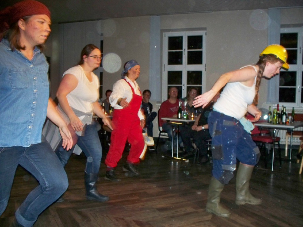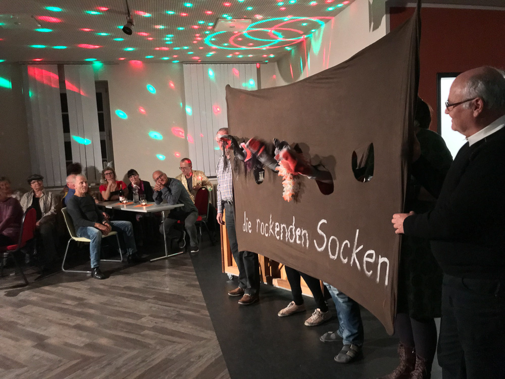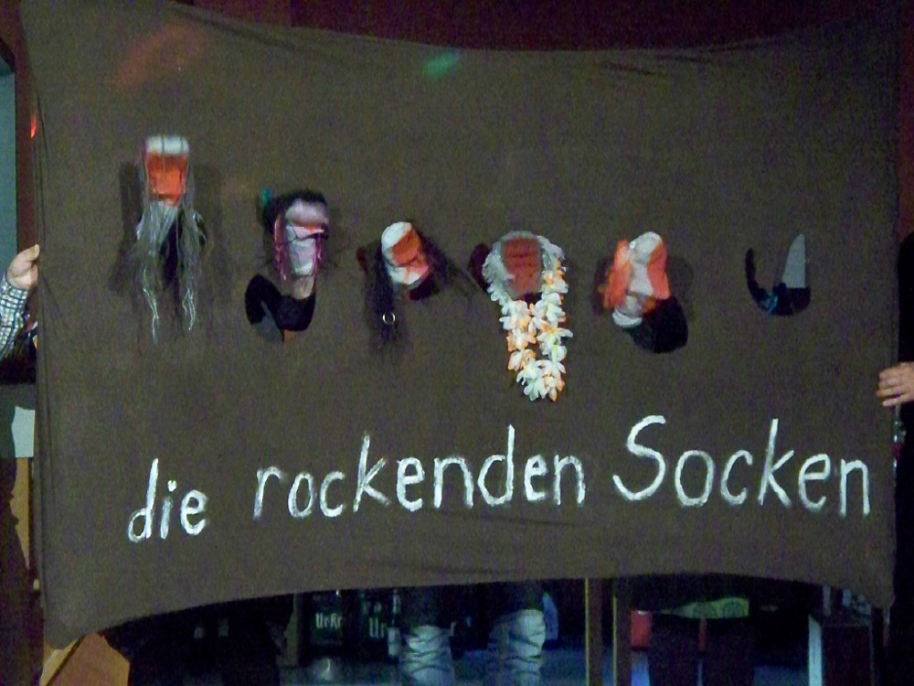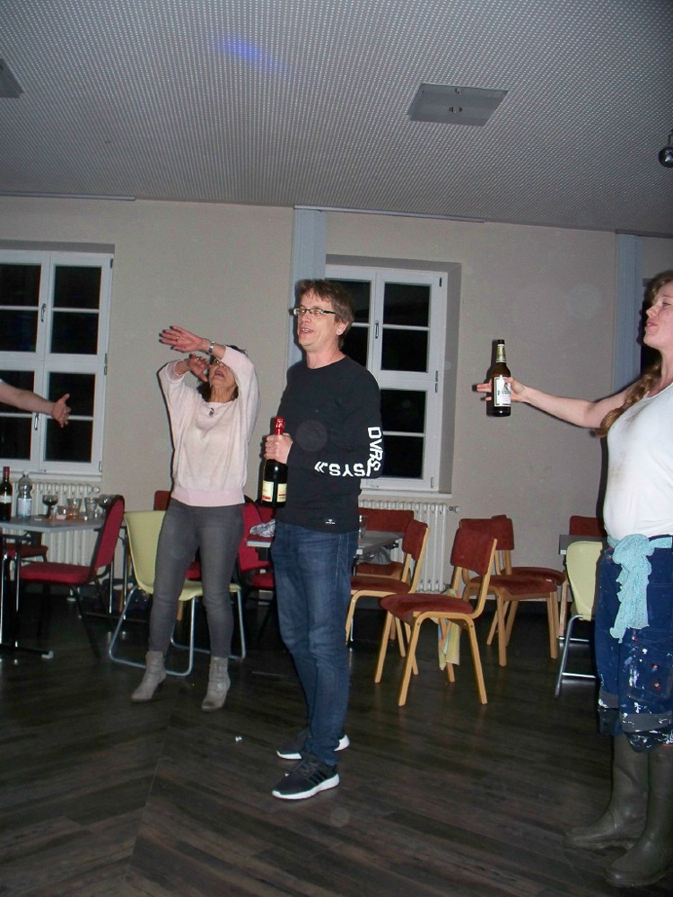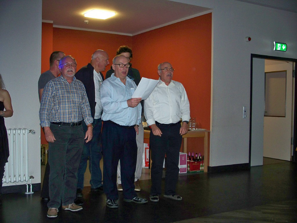 Der Abend nahte und mit ihm der Zeitpunkt so mancher Uraufführung; unsere Kulturbeiträge waren geplant, groß daran zu feilen nicht mehr möglich und wir waren auch neugierig darauf, was die anderen darbieten würden. Chrissy, Torsten (unser Neuling im Bass) und ich hatten uns freiwillig dazu bereit erklärt, den Anfang zu machen. Wir wollten es einfach hinter uns haben, um dann entspannt mit den anderen zu feiern. So brachten wir unser Team-Spiel für Chorleitung und Vorstand, welches zeigte, dass sie sich blind verstehen und „die rockenden Socken“ als ersten Beitrag und sicherten uns die Aufmerksamkeit aller. Was dann kam riss uns aber total vom Hocker; schauspielerische Glanzleistungen wechselten sich ab mit witzigen Referaten z. B. über Busengrößen, Stuhlgang und Männer im Gesangsverein. Wir lernten ein bisschen frivole Versionen von „Besame Mucho“ kennen, wurden zu Rundgesängen motiviert und Wodka-Zischer von den Blauen sinnierte über Frau Merkels Zukunftsperspektiven. Selten so lange gelacht. Selbst unser Chorleiter-Trio führte eine witzig-originelle Version von „Hit the Road-Jack“ auf und einer der Sänger brachte uns eine Version von „Bruder Jacob“ bei, die „S größte Schneckli“ heißt, mit der wir künftig bei den Schweizern punkten könnten.