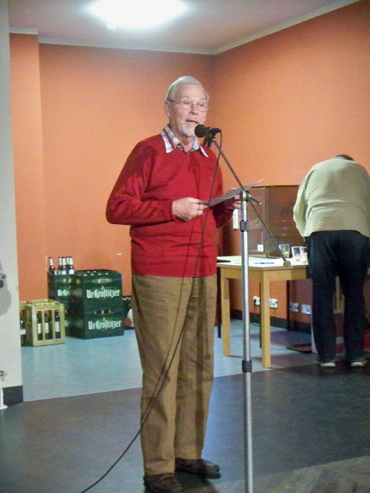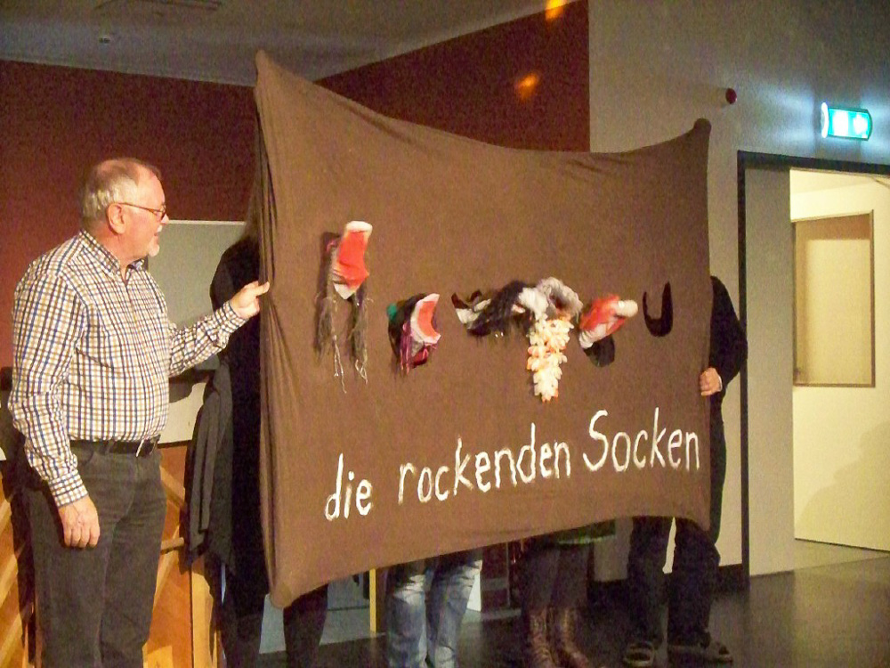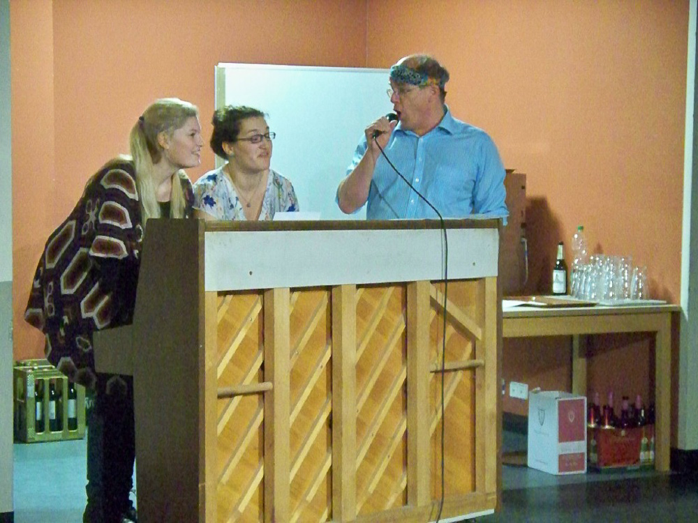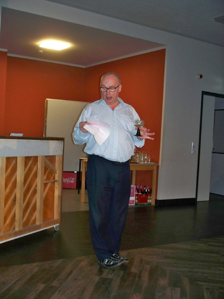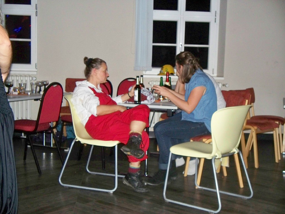 Der Abend nahte und mit ihm der Zeitpunkt so mancher Uraufführung; unsere Kulturbeiträge waren geplant, groß daran zu feilen nicht mehr möglich und wir waren auch neugierig darauf, was die anderen darbieten würden. Chrissy, Torsten (unser Neuling im Bass) und ich hatten uns freiwillig dazu bereit erklärt, den Anfang zu machen. Wir wollten es einfach hinter uns haben, um dann entspannt mit den anderen zu feiern. So brachten wir unser Team-Spiel für Chorleitung und Vorstand, welches zeigte, dass sie sich blind verstehen und „die rockenden Socken“ als ersten Beitrag und sicherten uns die Aufmerksamkeit aller. Was dann kam riss uns aber total vom Hocker; schauspielerische Glanzleistungen wechselten sich ab mit witzigen Referaten z. B. über Busengrößen, Stuhlgang und Männer im Gesangsverein. Wir lernten ein bisschen frivole Versionen von „Besame Mucho“ kennen, wurden zu Rundgesängen motiviert und Wodka-Zischer von den Blauen sinnierte über Frau Merkels Zukunftsperspektiven. Selten so lange gelacht. Selbst unser Chorleiter-Trio führte eine witzig-originelle Version von „Hit the Road-Jack“ auf und einer der Sänger brachte uns eine Version von „Bruder Jacob“ bei, die „S größte Schneckli“ heißt, mit der wir künftig bei den Schweizern punkten könnten.