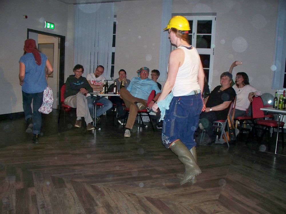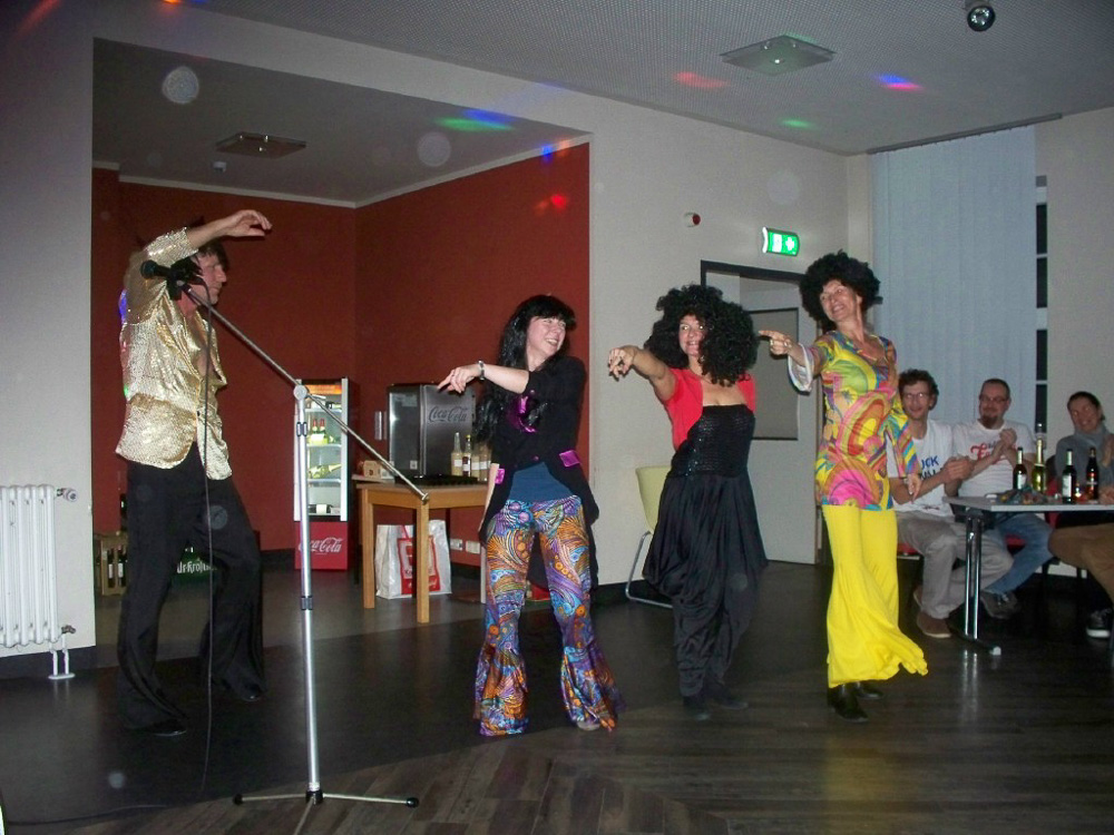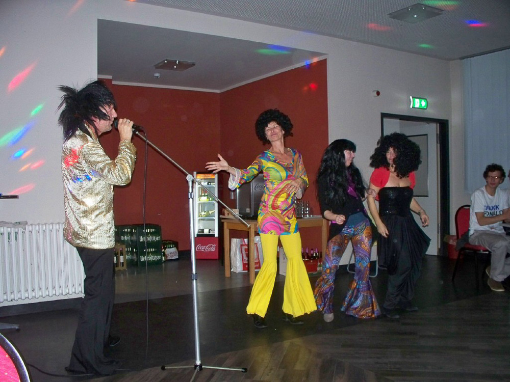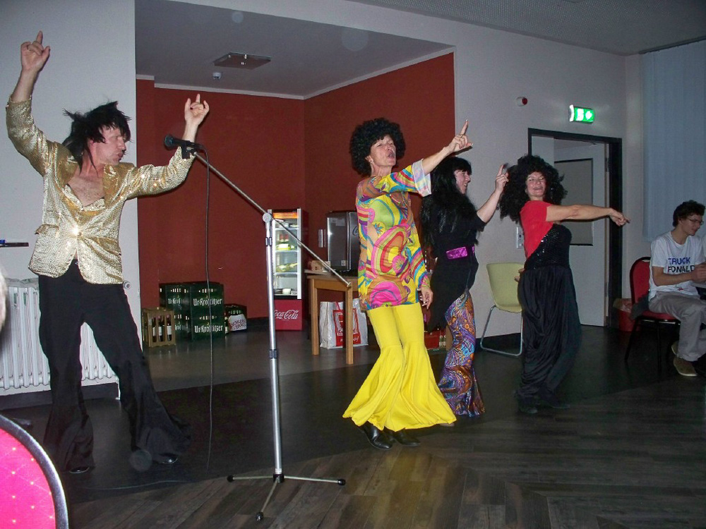 Eins der Mädels-Zimmer tanzte den „Gun Boots“ der afrikanischen Minenarbeiter und – damit das authentisch wirkt – sahen sie auch so aus. Hahaha, es war einfach herrlich und wir haben nicht an Applaus gespart. Bonny M war auch dabei mit originalen Kostümen und Micha als Daddy Cool war echt voll der Brüller. Bettina mit dem Paraplü und Hannes mit dem Aufsatz eines Schülers über (P)Fortpflanzung – alle waren Klasse.