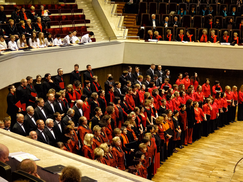 Bis zum Beginn des Konzerts verging die Zeit mit Auftrittsprobe in dem wirklich beeindruckenden Konzertsaal, Abstimmung mit den gleich uns hier auftretenden 3 Chören und Einsingen recht schnell. Dabei konnten auch wir uns von der hervorragenden Akustik des Saales überzeugen. Schließlich die Spannung beim Eintreten in den Saal und Aufstellen auf der Bühne: Wie wird wohl die Resonanz sein? Wir waren sehr erfreut, denn von den 1900 Plätzen des Saales war nur ein sehr geringer Teil unbesetzt.
