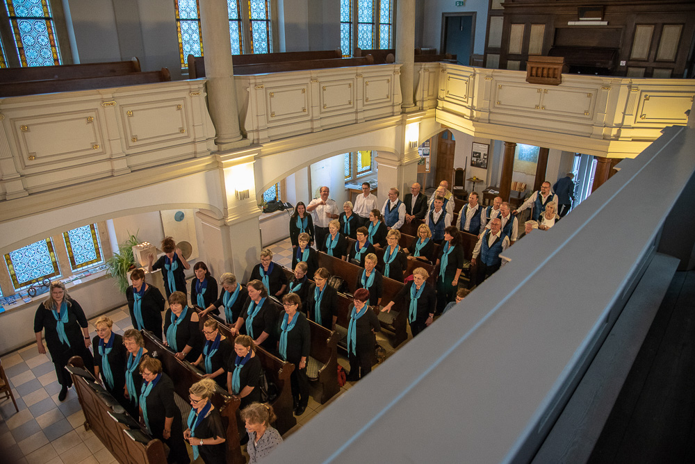 Lydia Schlenkrich führte charmant und unterhaltsam durch das Programm. Gegenüber – vor der kleinen Kirche – standen unsere Gastgeber, und so sangen wir unsere Lieder immer abwechselnd zu den verschiedenen Themen, wie z. B. (Liebe – Herz/Schmerz – Musik – Wein). Unsererseits war auch der Ohrwurm von den Wise Gyse dabei. Einen solchen hatten wir schon während der Proben in den letzten Wochen vor allem bei der Melodie des Titels „Drei Haselnüsse für Aschenbrödel“. Unser Chorleiter Torsten Petzold sorgte gelegentlich zusätzlich für Entertainment, wenn ein zartes Gebirgslüftchen ihm die Noten vom Ständer zu wehen versuchte.