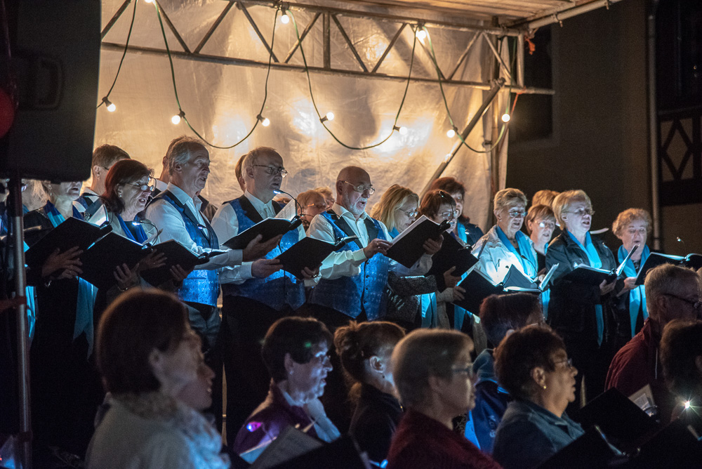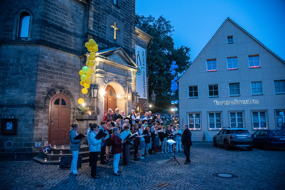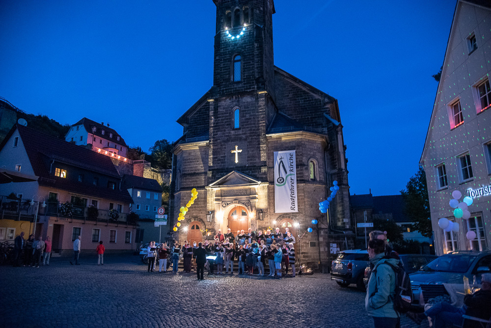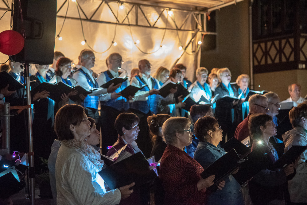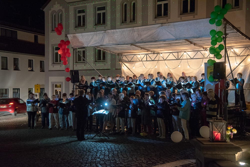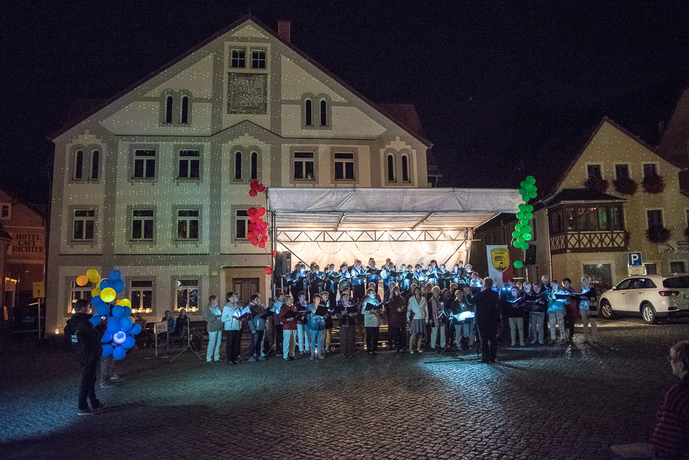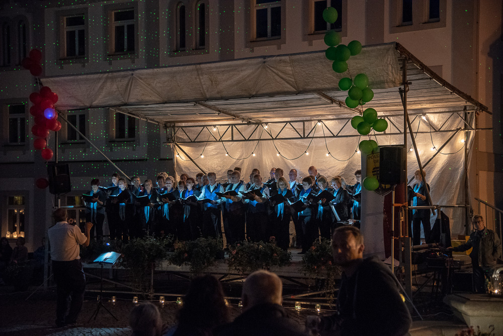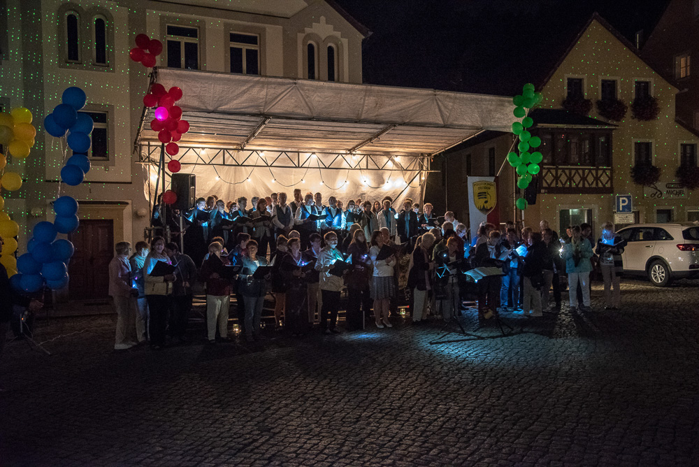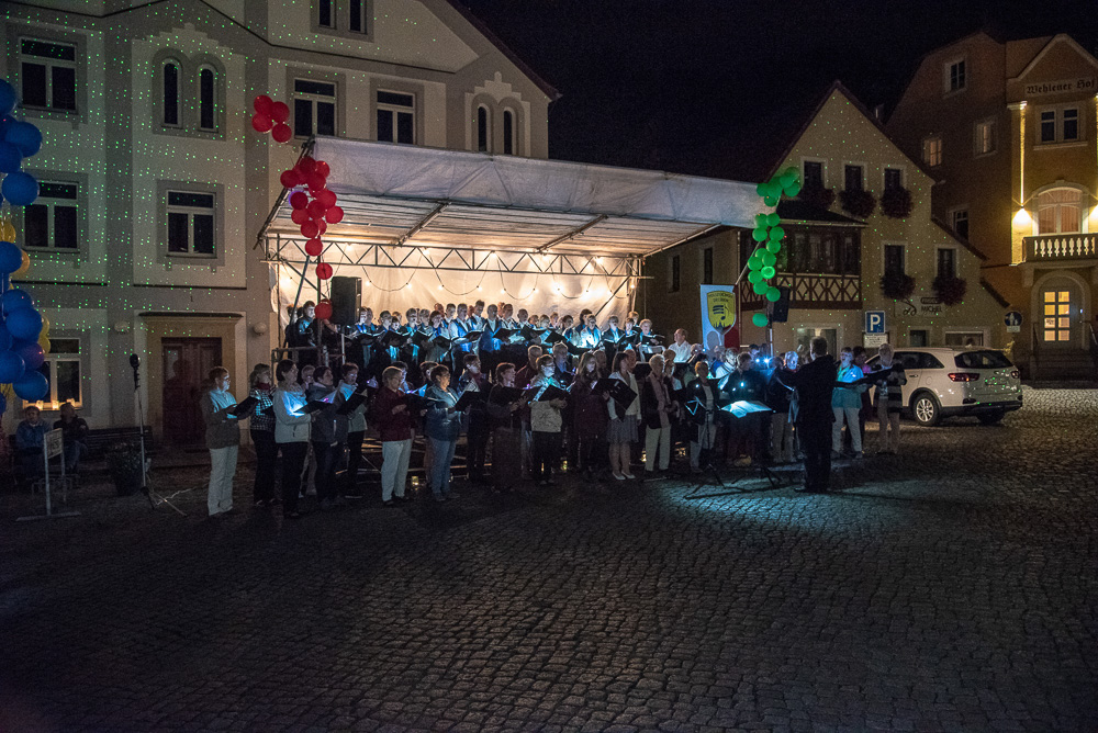 Wo? In Wehlen. Am Samstag, dem 8. September 2018 waren wir als Gäste der Chorgemeinschaft Dohna-Wehlen (selbige unter der Leitung von Herrn Jerxsen) zu einem Konzert der besonderen Art eingeladen. Die Gastgeber eröffneten das romantische Singen zur 6. Nacht der 1.000 Lichter mit dem Lied „Du sonniges Wehlen, du Perle der Schweiz“. Die Freilichtbühne am Rande des Marktplatzes war für uns aufgebaut, und wir begannen mit dem Lied „Wochenend und Sonnenschein“.