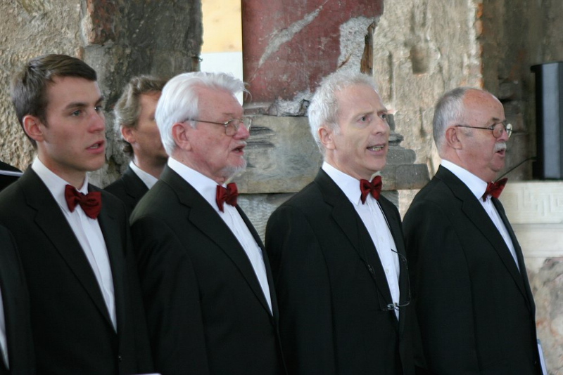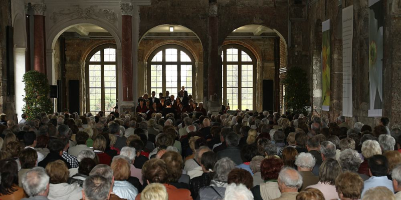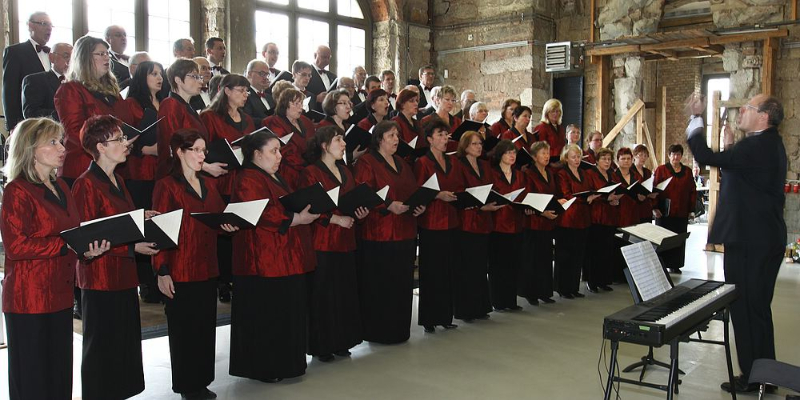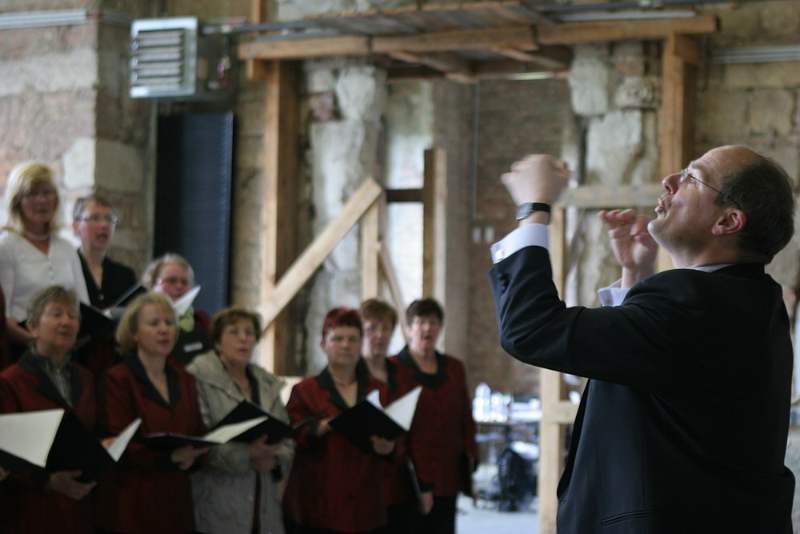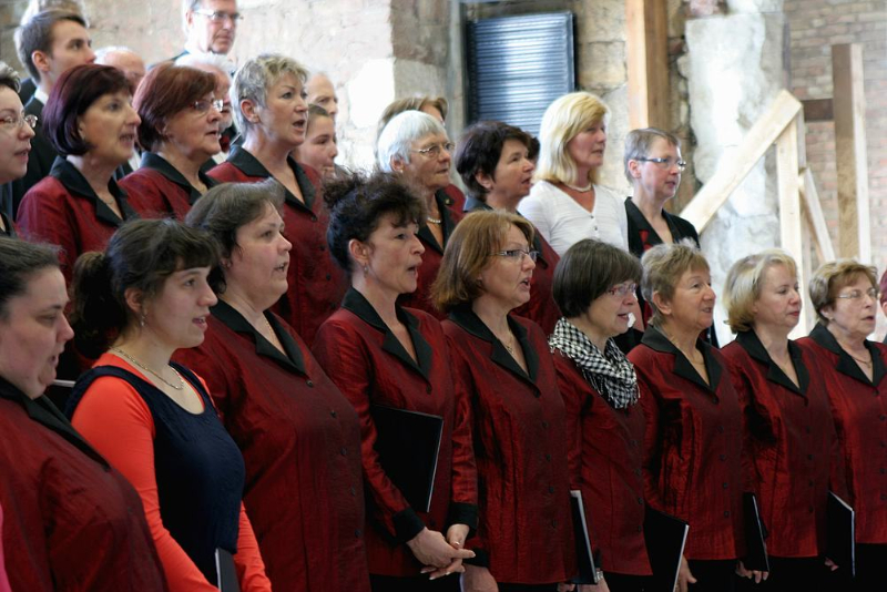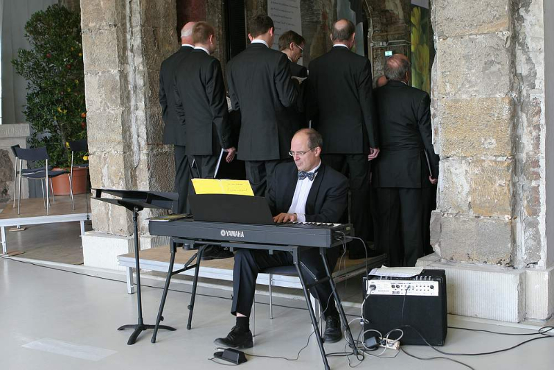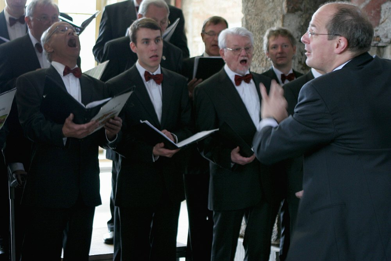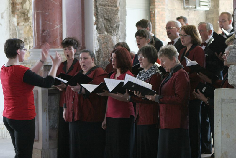 Vor drei Jahren gestalteten wir unser Frühjahrskonzert schon einmal im Palais des Großen Gartens von Dresden. Seit dieser Zeit ist das Äußere des Gebäudes restlos wieder hergestellt worden und strahlt wie zu seiner Entstehung im Jahr1685. Die Besucher von Konzerten und Ausstellungen sehen sich aber im Inneren des Palais noch immer mit den Wunden des 2. Weltkrieges konfrontiert. Die trüben Gedanken beim Blick auf balkengestützte Mauern und nackte Wände wurden allerdings schnell vertrieben, als der Polizeichor „am Strauch die Knospen springen“ ließ (Smetana), den sanften, süßen Hauch des Frühlings und die Wiederkehr der Primel (Mendelssohn-Bartholdy) besang. Auch die von Sängerinnen des Chores mit frischen Blumen geschmückten Kübelbäume im Saal und die durch die Fenster strahlende Sonne wirkten dahin, dass der Eindruck des Frühlings vollendet wurde.
