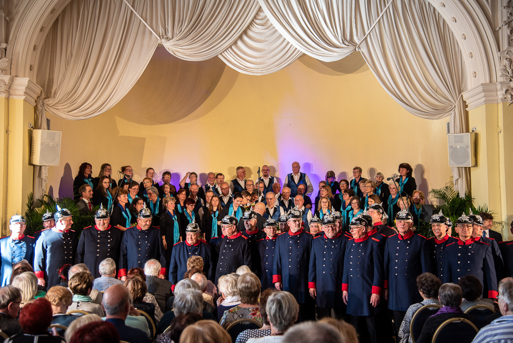 Der Polizeichor Ahaus glänzte mit einem ganz abwechslungsreichen Programm. Im ersten Teil überwogen noch moderne Lieder wie „Freiheit“ von Marius Müller-Westernhagen oder „Über sieben Brücken musst du gehn“ bekannt geworden durch die Gruppe „Karat“ oder durch Peter Maffay, je nachdem in welchem Teil Deutschlands man zuhause ist. Nach der Pause marschierte der Polizeichor Ahaus in historischer Uniform zum Rhythmus des Deutschmeister-Regimentsmarschs in den Ballsaal „Lindengarten“ ein. Beim Fliegermarsch von Hermann Dostal sangen nicht nur die Herren vom Männerchor Ahaus, sondern hinter der Bühne summte auch der gesamte Polizeichor Dresden mit. Denn diesen Marsch aus der Operette „Der fliegende Rittmeister“ hatten wir im letztjährigen Frühjahrskonzert im Programm.