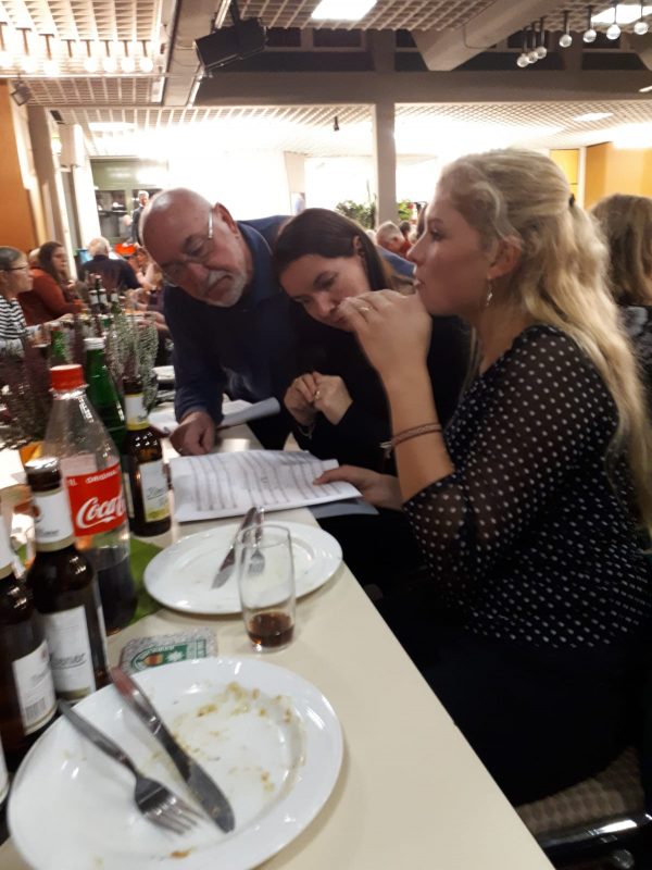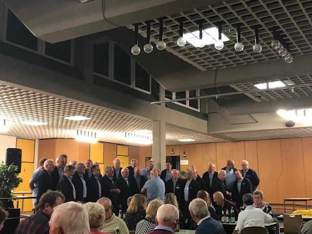 Beim geselligen Abend in der Aula der Canisiusschule Ahaus hatten wir Gelegenheit, unsere Gastgeber noch besser kennen zu lernen bzw. die mitgereisten Sänger vom Frühjahrskonzert wiederzusehen. Dabei begeisterte uns spontan die herzliche Gastfreundschaft der Sänger des Polizeichores Hamaland Ahaus. Nicht nur ein reichhaltiges Abendessen sondern auch liebevoll von Paule persönlich servierte Flüssigkost sorgten für innere Wärme. Natürlich wurde auch noch gesungen und gelacht, wie es sich für zwei stimmgewaltige Polizeichöre gehört.
