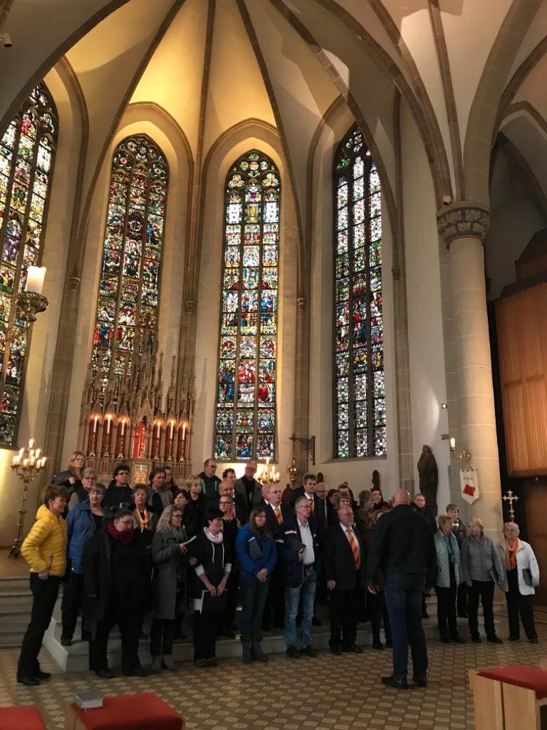 Auf unseren Wunsch hin, begleiteten wir an Allerheiligen eine katholische Messe in der St.-Agatha-Kirche in Gronau-Epe. Am Gemeindehaus der Kirche gab es ein Wiedersehen mit einigen Sängern des Polizeichores Ahaus. Die Stellprobe in der Kirche und das anschließende Einsingen fielen ungewohnt knapp aus und ehe wir uns versahen, begann die Messe in der St.-Agatha-Kirche. Während unseres Auftrittes begleitete uns FDB Jürgen Etzrodt (anerkannter deutscher Berufschorleiter) an der Orgel. Er war lange Jahre als Kirchenmusiker in dieser Gemeinde tätig. Der Polizeichor Dresden hat schon öfter katholische Messen musikalisch begleitet, aber der junge Pfarrer hat uns mit seiner freundlichen und offenen Art sowie der dynamischen Predigt überrascht. Da war es dann auch kein Wunder, dass unser Liedgut u.a. „Gib mir die richtigen Worte“, „Locus iste“ und „The Lord bless you and keep you“ gut aufgenommen wurden.