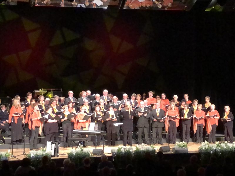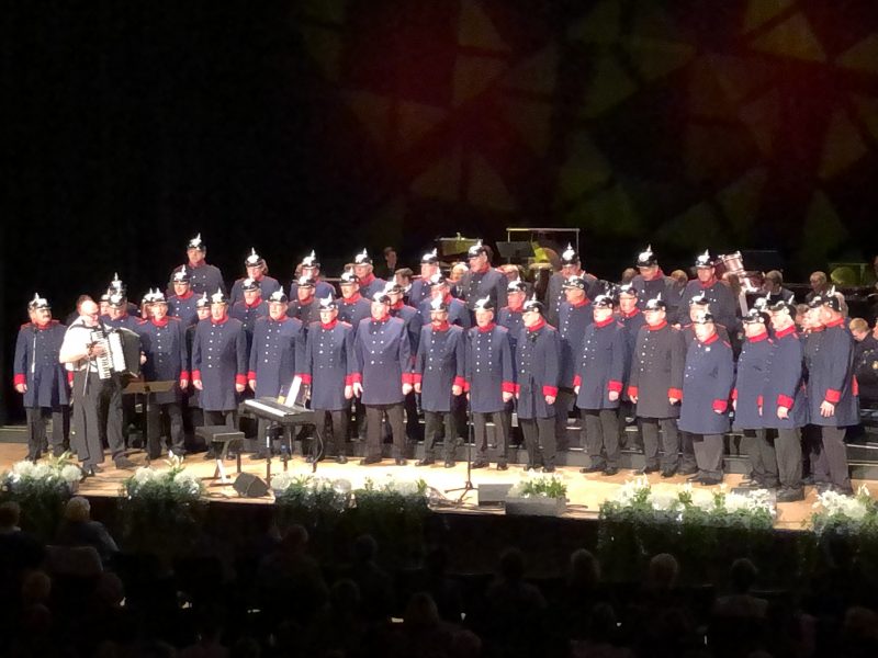 „Uns Udo“ war das musikalische Motto des Konzertes, welches wir uns im ersten Teil mit unserem Udo Jürgens Medley und „Mit 66 Jahren“ auch zu Eigen machten. Besonders da der Polizeichor Dresden in diesem Jahr 66 Jahre alt ist. Unsere beiden Chorleiter Torsten Petzold und Emelie Walther liefen im Laufe des Abends zu Hochform auf und steckten uns damit an. In Sachen Entertainment schreckten unsere Männer auch vor nichts zurück und traten bei Udo Jürgens in weißen Bademänteln auf. Als Torsten so auf die Bühne kam, viel selbst dem Moderator nichts mehr ein, außer die grünen Schuhe als unpassend zu „bemängeln“. Im zweiten Teil zeigten wir die Vielfältigkeit unseres Repertoires. Vom jüdischen Liebeslied, über ein slawisches Tanzlied und ein französisches Trinklied war alles dabei. Mit „Wochenend und Sonnenschein“ verabschiedeten wir uns zum fortgeschrittenen Abend.