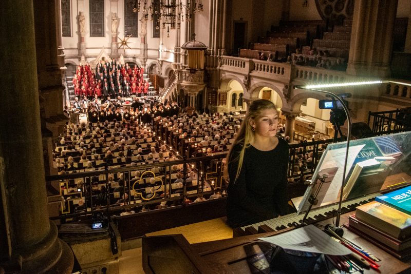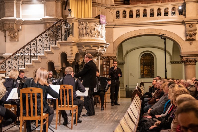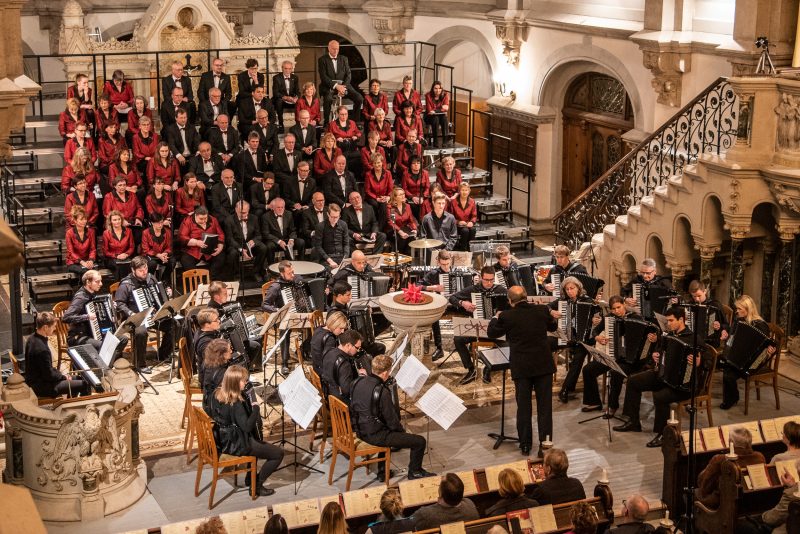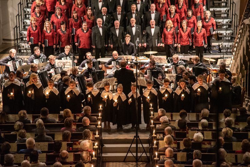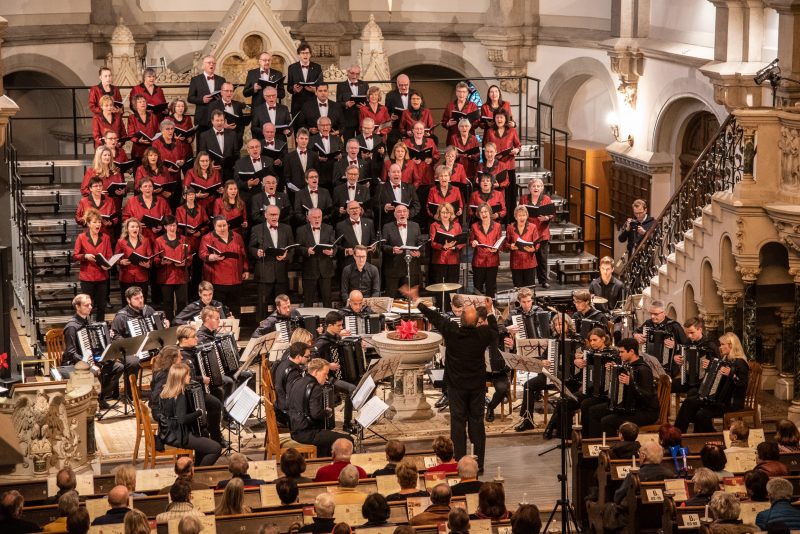 Bereits vor dem eigentlichen Einlass standen die ersten Zuhörer in der Kirche bereit, angelockt von den Klängen der letzten Proben des Polizeichores. Noch während sich die Kirche füllte, spürte man die aufgeregte Erwartung, welche sich unter Zuschauern und Musikern gleichermaßen ausbreitete. Eröffnet wurde das Konzert durch die weihnachtliche Orgelimprovisation unserer zweiten Chorleiterin Emelie Walther, welche bekannte Melodien mit Neuen verband. Mit einer kleinen Weihnachtsgeschichte begrüßte Lydia Schlenkrich die Zuhörer und stellte das Akkordeonorchester vor, welches nach 2013 bereits zum zweiten Mal Gast beim Polizeichor war. Von seiner weithin bekannten Qualität konnte man sich bereits beim „Hallelujah“ aus dem Oratorium „Der Messias“ von Georg Friedrich Händel überzeugen, welches das Akkordeonorchester zusammen mit dem Polizeichor zum Klingen brachte. Trotz eher milder Temperaturen gelang es dem Akkordeonorchester mit dem „Sleigh Ride“ von Leroy Anderson sowie Richard Eilenbergs rasanter „Petersburger Schlittenfahrt“ die Zuschauer auch ohne Schnee in weihnachtliche Stimmung zu versetzen. Bei diesem Lied erklärte sich auch so manchem Besucher das Schlagzeug inmitten eines Akkordeonorchesters. „Sandmännchen und Abendsegen“ (Engelbert Humperdinck) zeigten dagegen eine ganz andere Seite der musikalischen Vielfalt des Orchesters, welches sich 2016 bei der Orchester-Weltmeisterschaft in Innsbruck in der höchsten Kategorie die Bronzemedaille erspielte. Doch die jungen Musiker können nicht nur spielen, zumindest Julian Feulner kann auch wunderbar singen. Mit seinem angenehmen Bariton träumte er mit uns von „Weißen Weihnachten“ („White Christmas“).