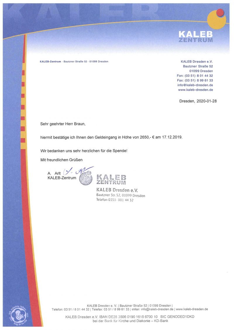 Die Kollekte war in diesem Jahr für den Verein KALEB e.V. in Dresden vorgesehen. Dieser Verein unterhält eine Kleiderkammer für Kinder und werdende Eltern auf der Bautzener Straße in Dresden, die sich ausschließlich über Spenden finanziert, und bietet ein vielfältiges Beratungs- und Kursangebot für traumatisierte Kinder, Jugendliche und deren Eltern an. Beide Konzerte haben zusammen eine Kollekte von 2.650 € erbracht. Die Vorstandsvorsitzende von KALEB e.V. Dr. Gesine Kabuß war überwältigt von der großzügigen Spende.