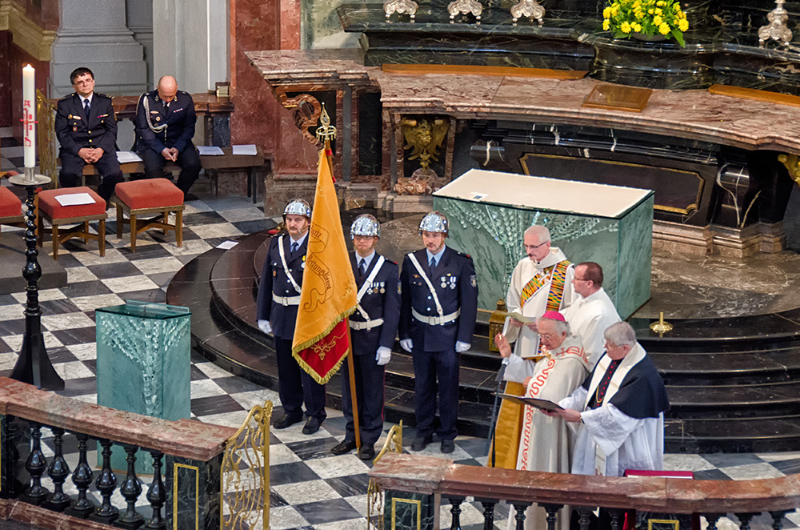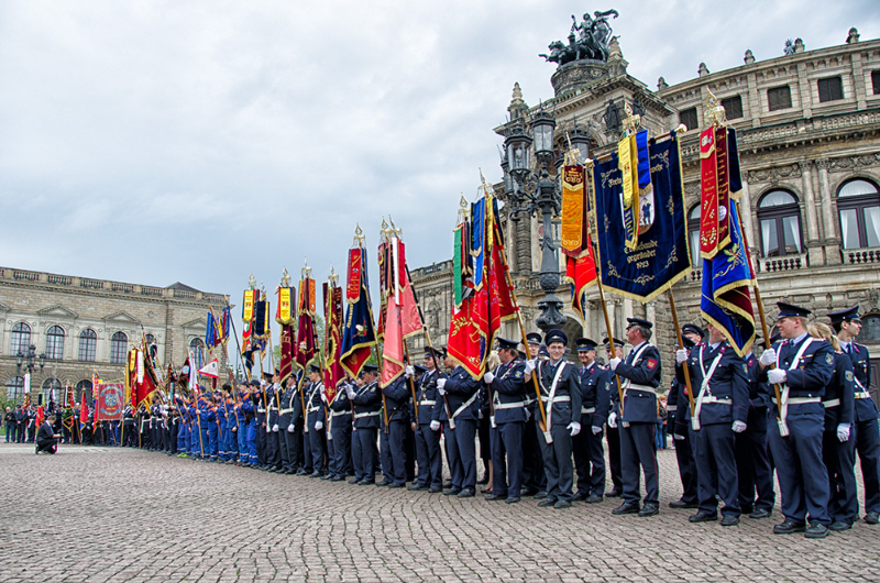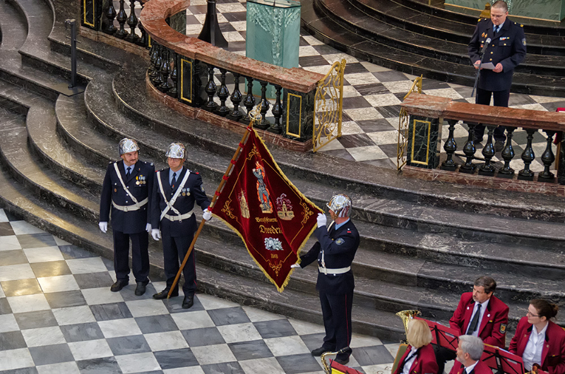 Glockengeläut leitete den Festgottesdienst in der gut besetzten Kirche ein. Es folgte der feierliche Einzug der Fahnen von 52 Feuerwehrdelegationen aus allen Teilen Deutschlands sowie aus Polen, Tschechien und Österreich. Er wurde vom Organisten der Kathedrale, Herrn Lennertz, auf der Silbermannorgel begleitet, ehe der PC Dresden unter der Leitung von Torsten Petzold mit „Singet dem Herrn“ von Heinrich Schütz, dem ersten von mehreren herausragenden Musikern und Komponisten Dresdens, seinen Einstand gab.