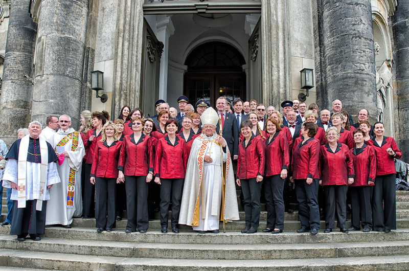 Der Begrüßung der Delegationen sowie einer Reihe von Persönlichkeiten der Stadt und der Feuerwehr durch den Vorsitzenden des Stadtfeuerwehrverbandes folgten die Ausführungen des Altbischofs zur Bedeutung dieses Gottesdienstes für die Feuerwehr, die von den 4 Schwerpunkten ihrer Arbeit handelten, dem Retten, Bergen, Löschen und Schützen, und danach die feierliche Zeremonie der Enthüllung, Vorstellung und Übergabe der Fahne an die Berufsfeuerwehr Dresdens sowie deren Segnung. Mit Orgelspiel und Glockengeläut sowie dem Auszug der Fahnendelegationen wurde der Festgottesdienst ebenso feierlich beendet, wie er begann. In seinem Schlusswort bedankte sich der Altbischof ausdrücklich beim Polizeichor und ließ uns wissen, dass wir gern wiederkommen könnten. Die Ehrengäste, unter.ihnen der Landtagspräsident Rösler, Bürgermeister Sittel sowie Bischof Reinelt trafen sich nach der Veranstaltung mit unserem Chor vor dem Eingang der Kathedrale zu einem Abschlussfoto.
