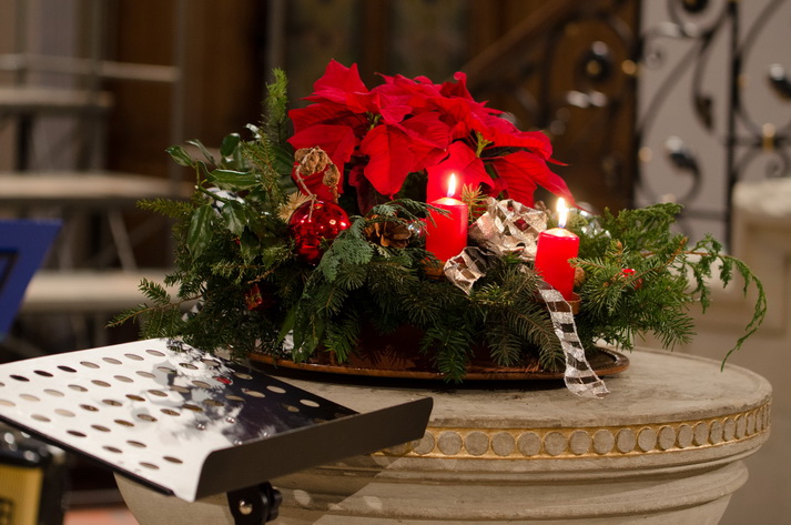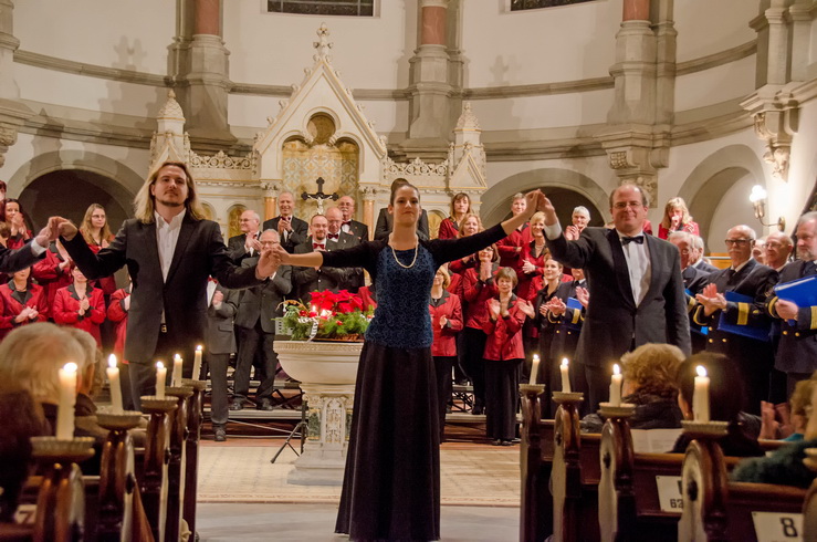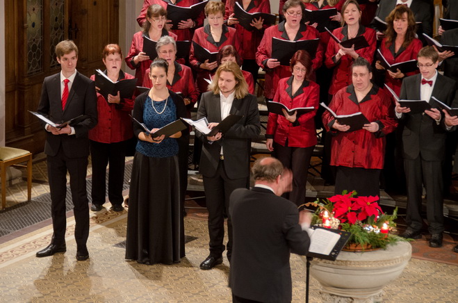 Bei der anschließenden Kantate „Magnificat“ von Dietrich Buxtehude kamen außer unserem Chor und seinen Musici auch das Blechbläserquintett, der Organist und die Solisten der Musikhochschule zum Einsatz. Diesem kraftvollen Werk folgte ein weiteres Sopransolo der Chorleiterin aus Hessen mit dem bekannten und beliebten „White Christmas“.