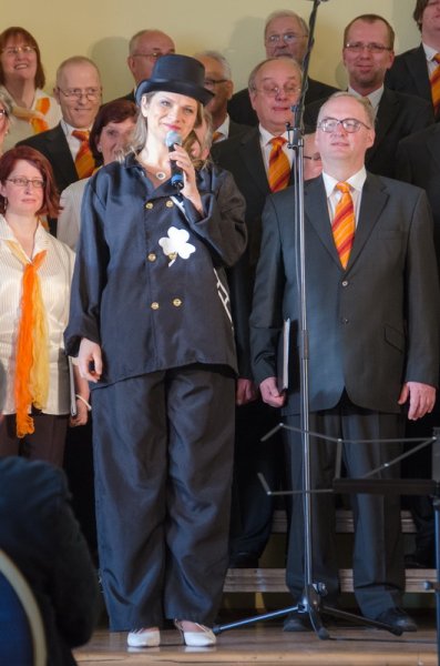 Im weiteren Verlauf des Konzertes bekamen auch die Konzertgäste die Möglichkeit, mitzusingen. Auch die Männergruppe des PC Dresden bot zwei Titel. Kathy Leen erklärte vorher den Hintergrund des bayrischen Volksliedes vom „Lieben Augustin“. Überhaupt zeigte sie im Laufe des Konzerts mehrmals sowohl Proben ihres sängerischen Könnens als auch ihres hervorragenden Talents, das Publikum mit ihrer Moderation zu begeistern. Ähnlich bewies auch die Dixielandformation noch mehrfach, dass sie allein und auch im Zusammenwirken mit dem Polizeichor das Publikum zu lebhaftem Beifall anregen kann.
