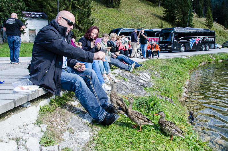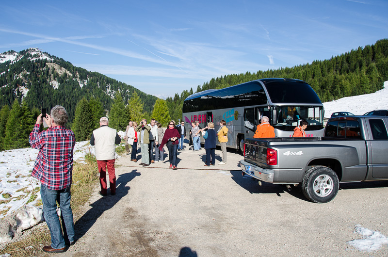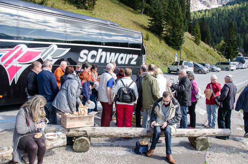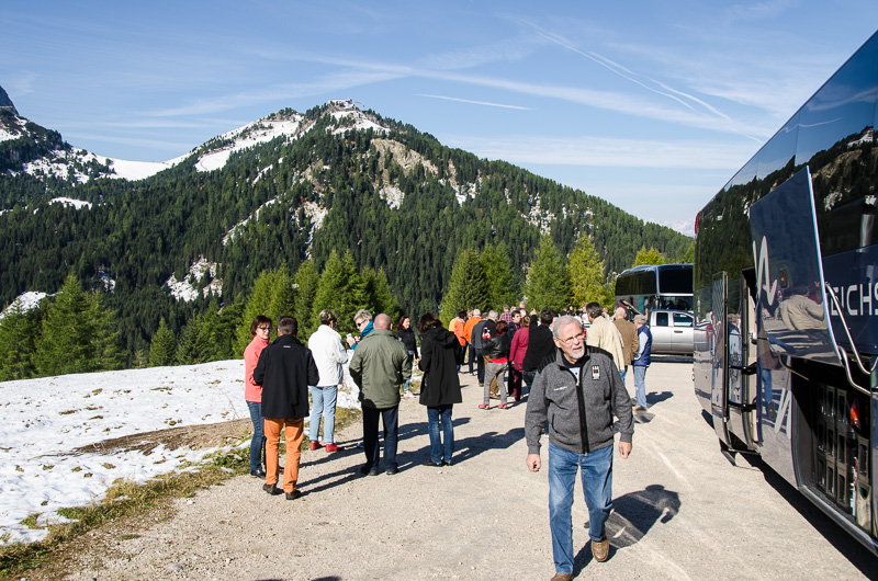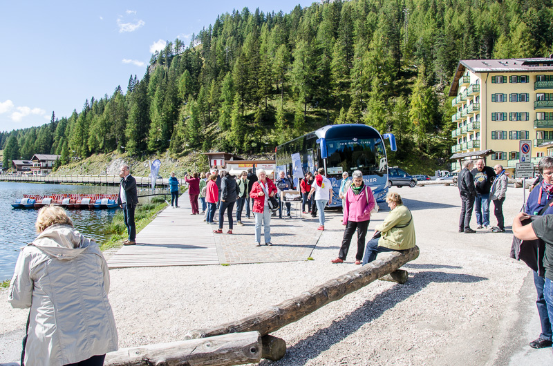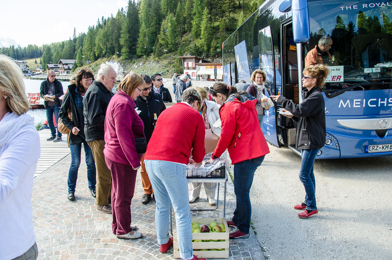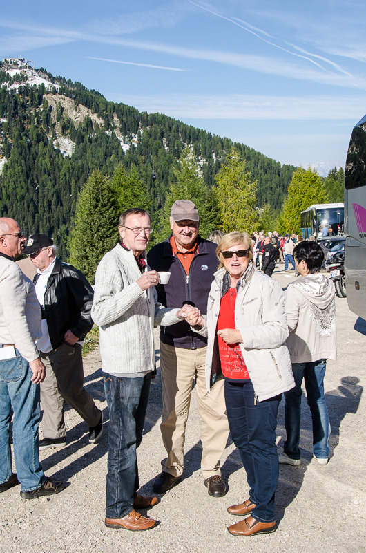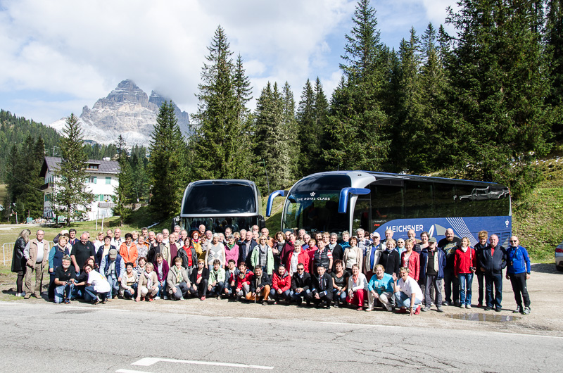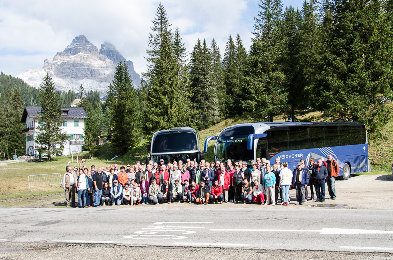 Nach der Weiterfahrt zum traumhaft gelegenen Misurina See haben wir dort die Zeit für eine ausgedehnte Brotzeit mit Kaminwurzen, Schinken, Käse und Schüttelbrot genutzt. Nach der Pause nutzten wir die Chance vor den „Drei Zinnen“ noch für ein Fotoshooting und für ein Dankeschön für unsere sehr netten und kompetenten Reiseführer. Dann ging es durch die faszinierende Landschaft zurück zu unseren Hotels. Ein paar von unseren „Bergbewohnern“ nutzten das zeitigere Ankommen um noch eine Wanderung um Latzfons zu machen.